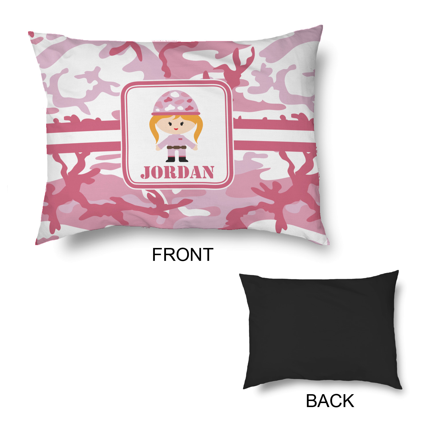 We have featured our little army girl, wearing her pink camo helmet, in the middle of the design in a pink and white square. A wide white band trimmed in pink tie everything together.