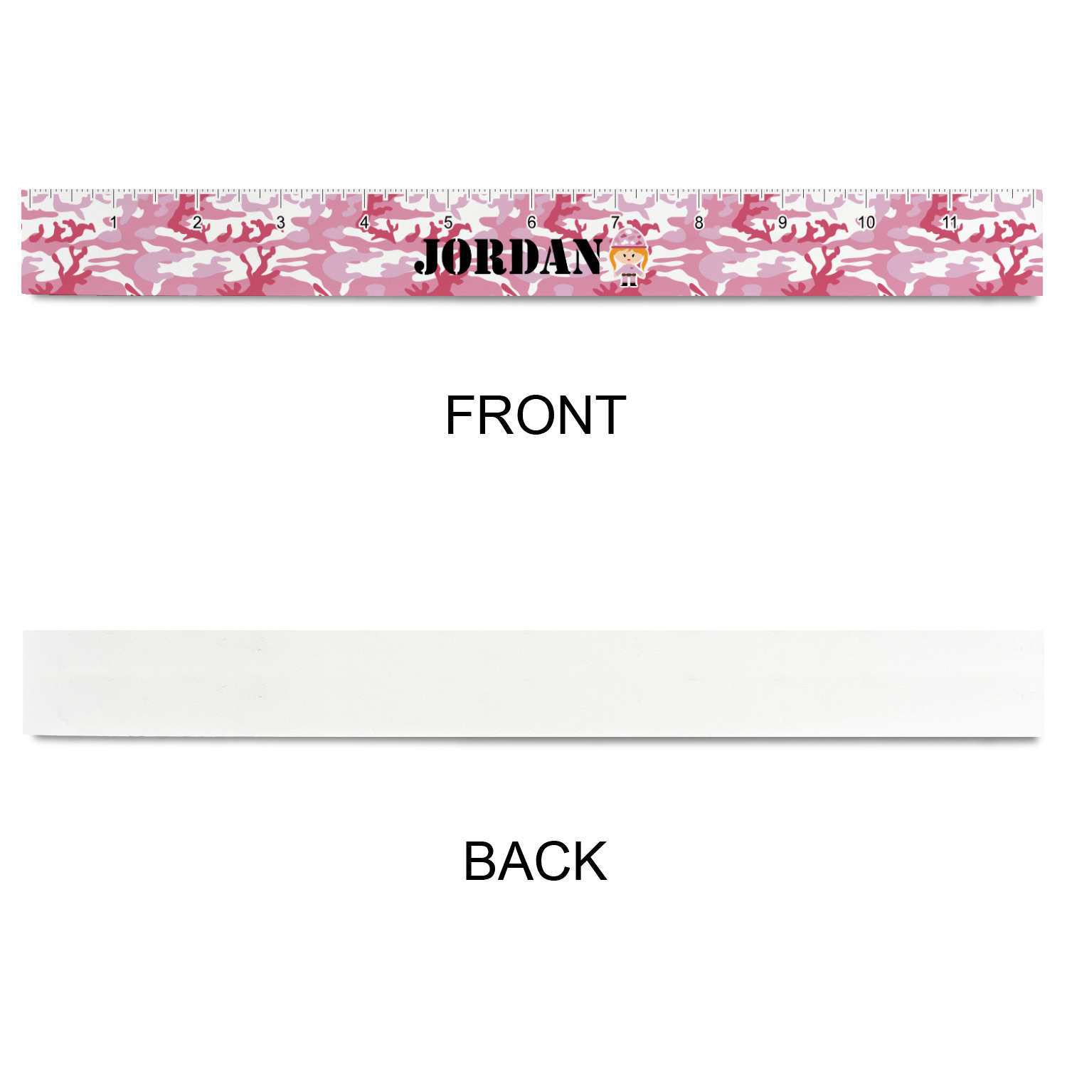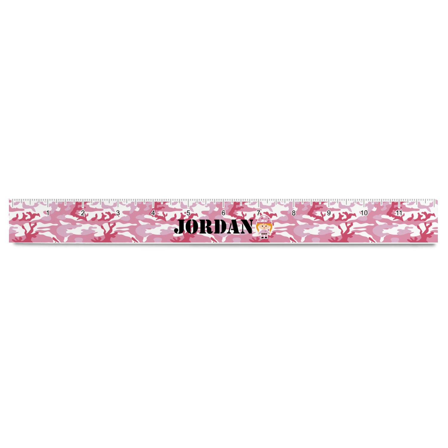 We have featured our little army girl, wearing her pink camo helmet, in the middle of the design in a pink and white square. A wide white band trimmed in pink tie everything together.