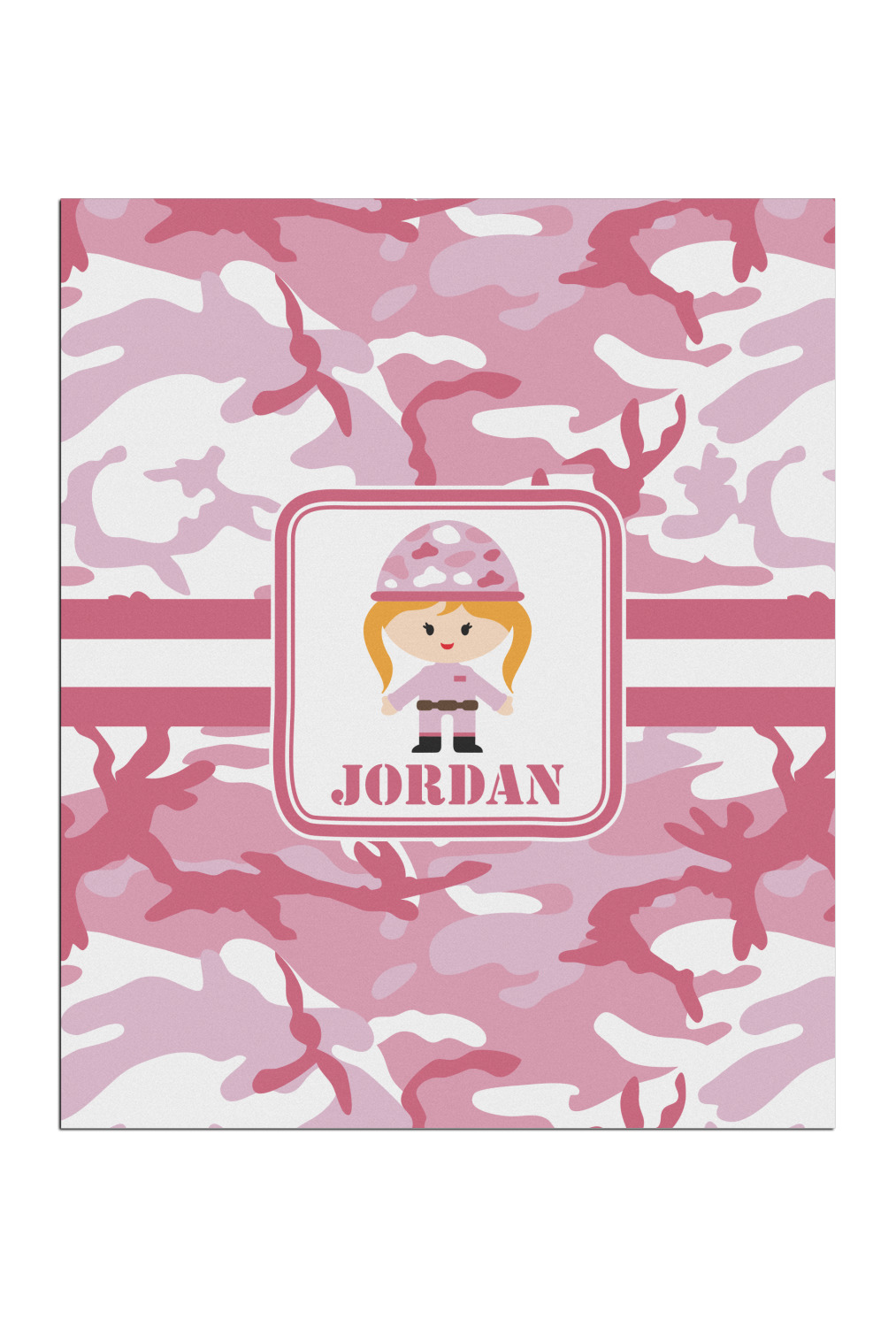We have featured our little army girl, wearing her pink camo helmet, in the middle of the design in a pink and white square. A wide white band trimmed in pink tie everything together.