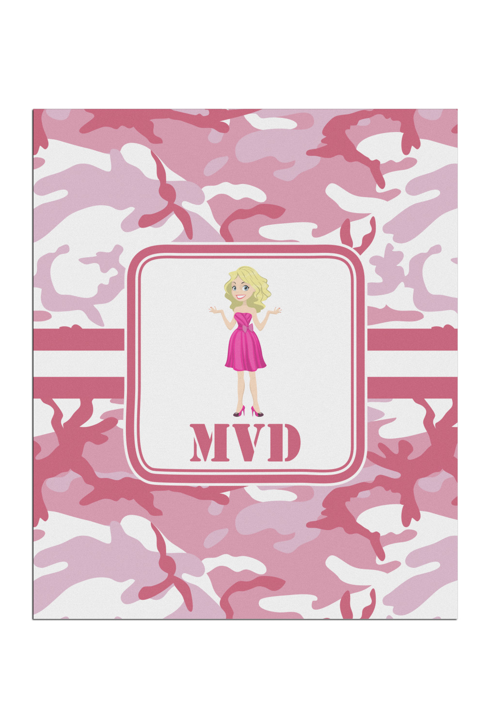 We have featured our little army girl, wearing her pink camo helmet, in the middle of the design in a pink and white square. A wide white band trimmed in pink tie everything together.