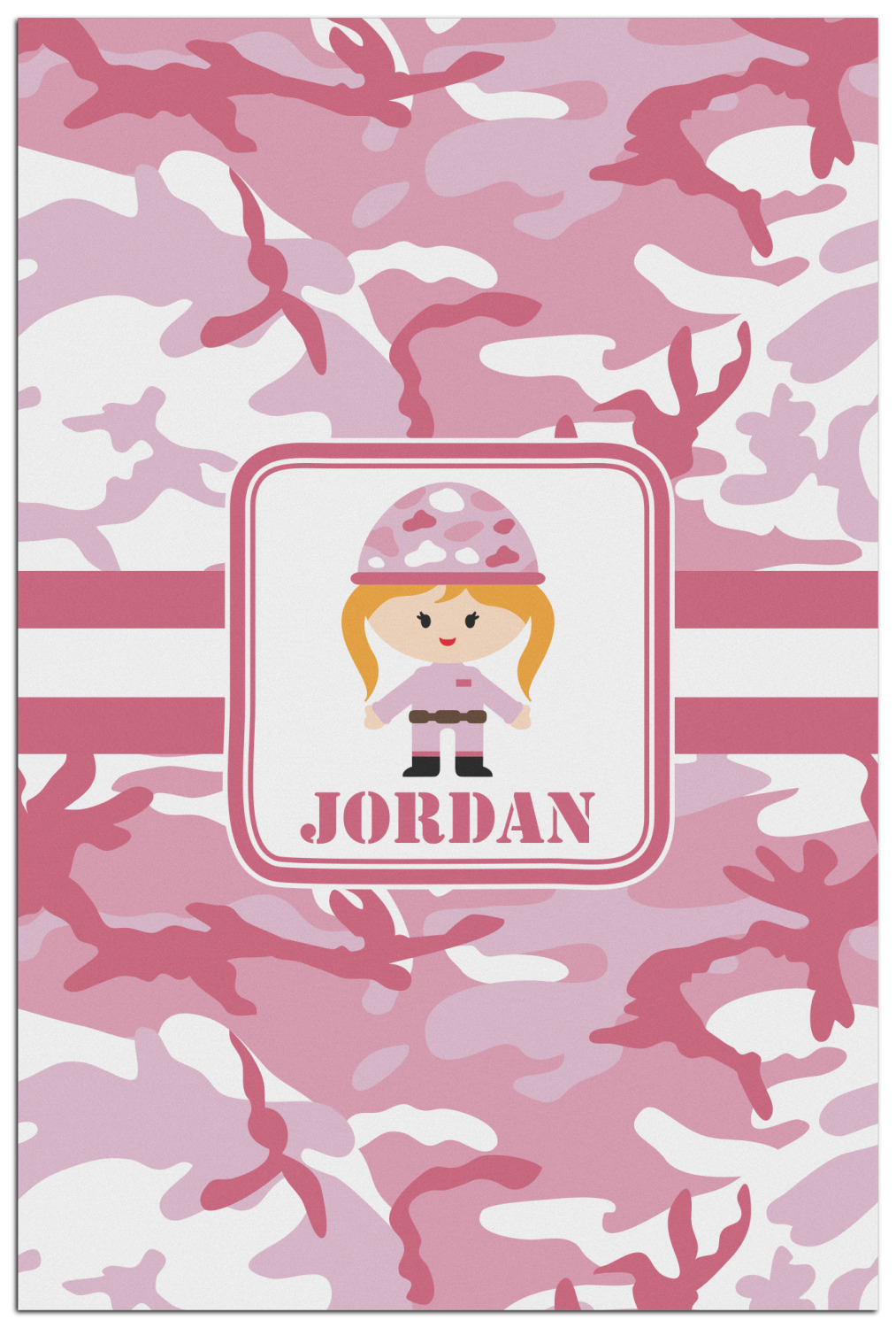We have featured our little army girl, wearing her pink camo helmet, in the middle of the design in a pink and white square. A wide white band trimmed in pink tie everything together.