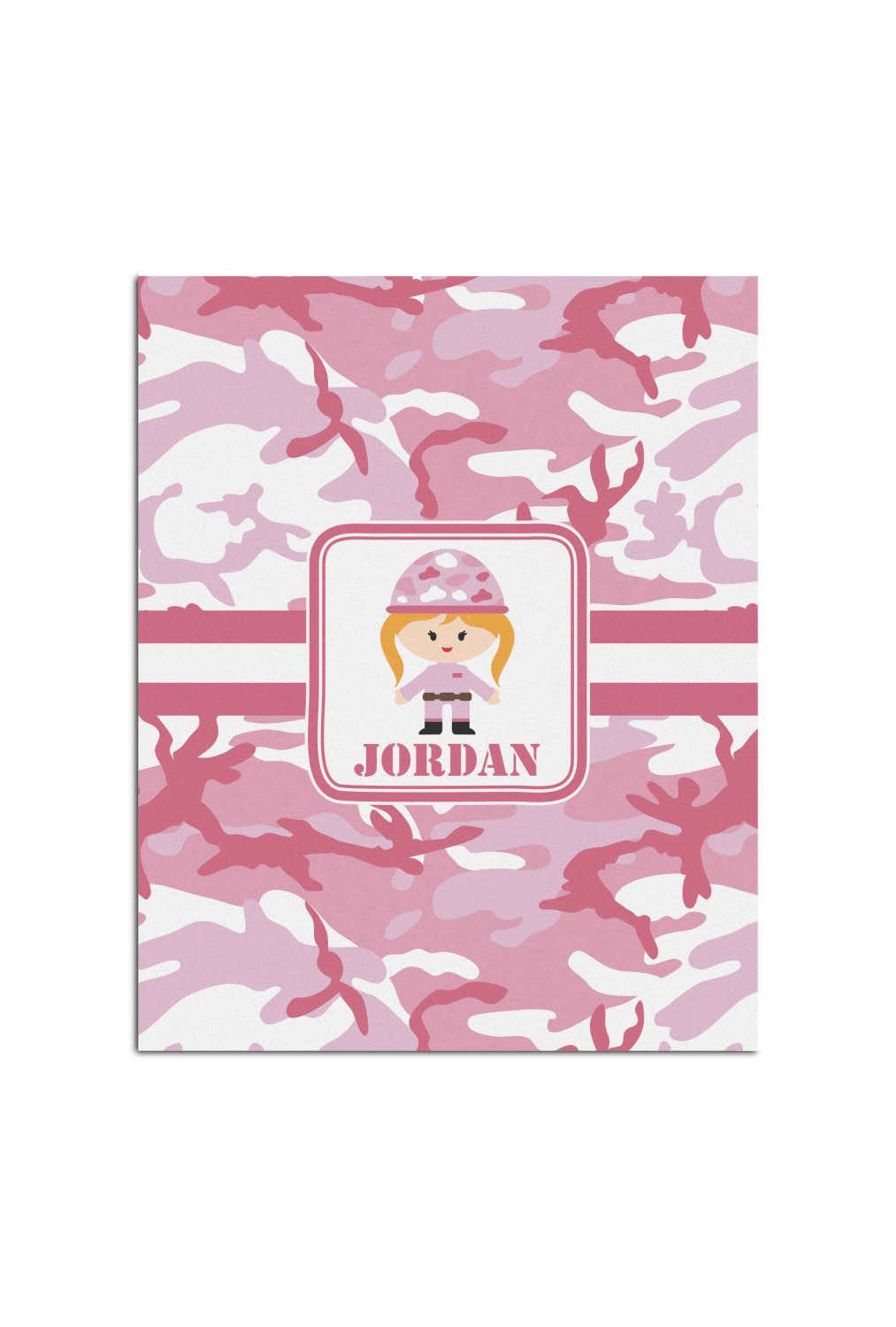 We have featured our little army girl, wearing her pink camo helmet, in the middle of the design in a pink and white square. A wide white band trimmed in pink tie everything together.