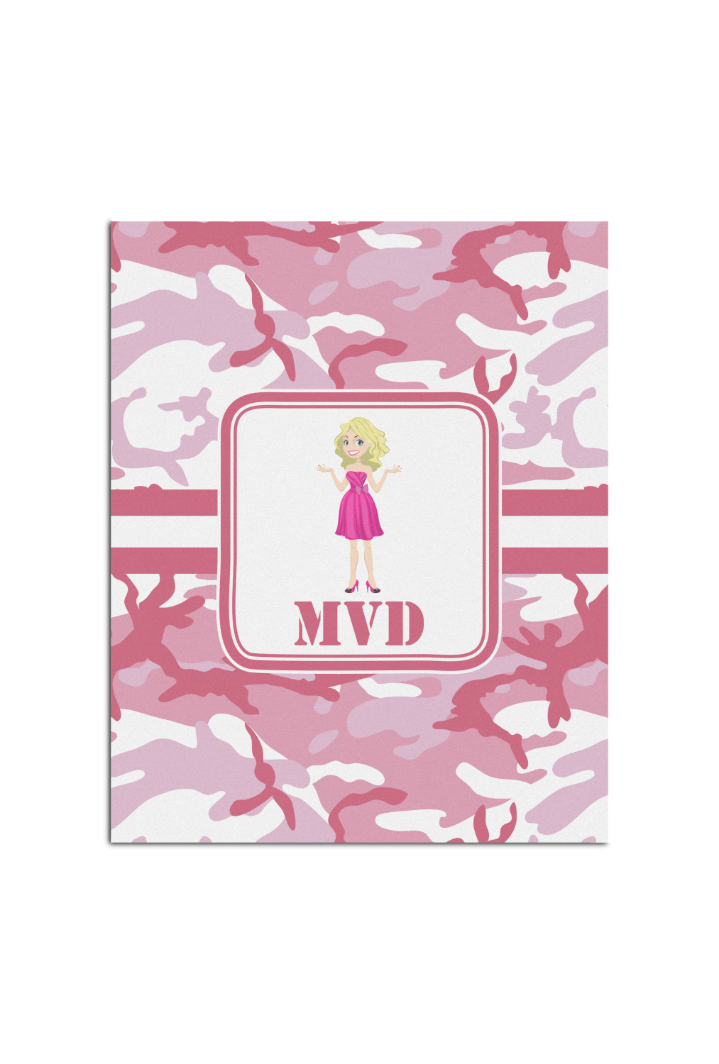 We have featured our little army girl, wearing her pink camo helmet, in the middle of the design in a pink and white square. A wide white band trimmed in pink tie everything together.