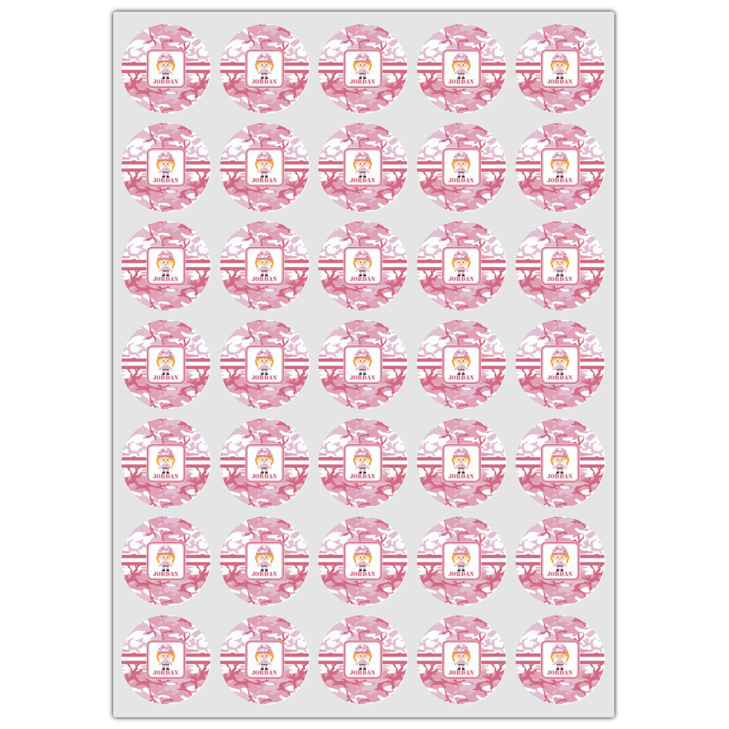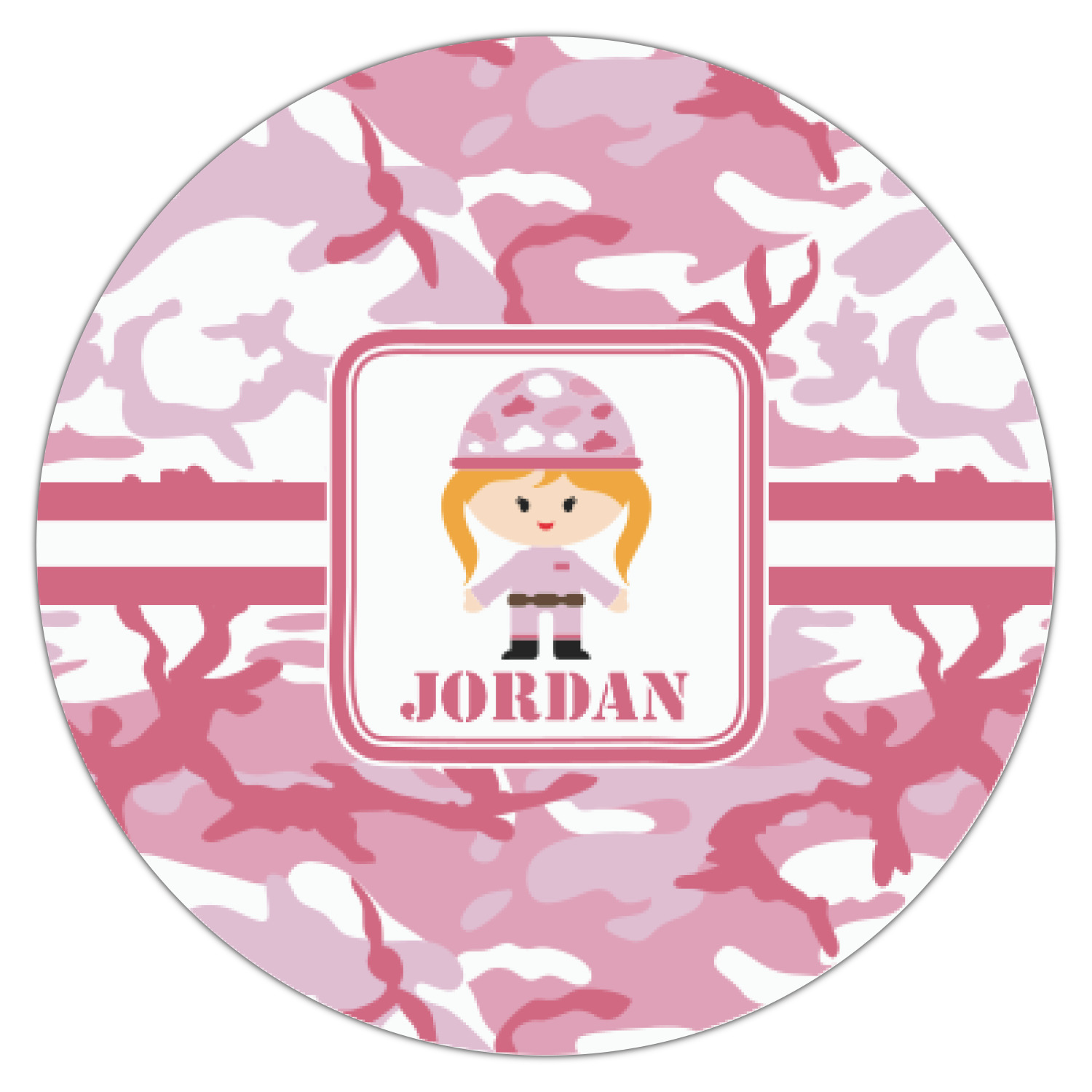 We have featured our little army girl, wearing her pink camo helmet, in the middle of the design in a pink and white square. A wide white band trimmed in pink tie everything together.