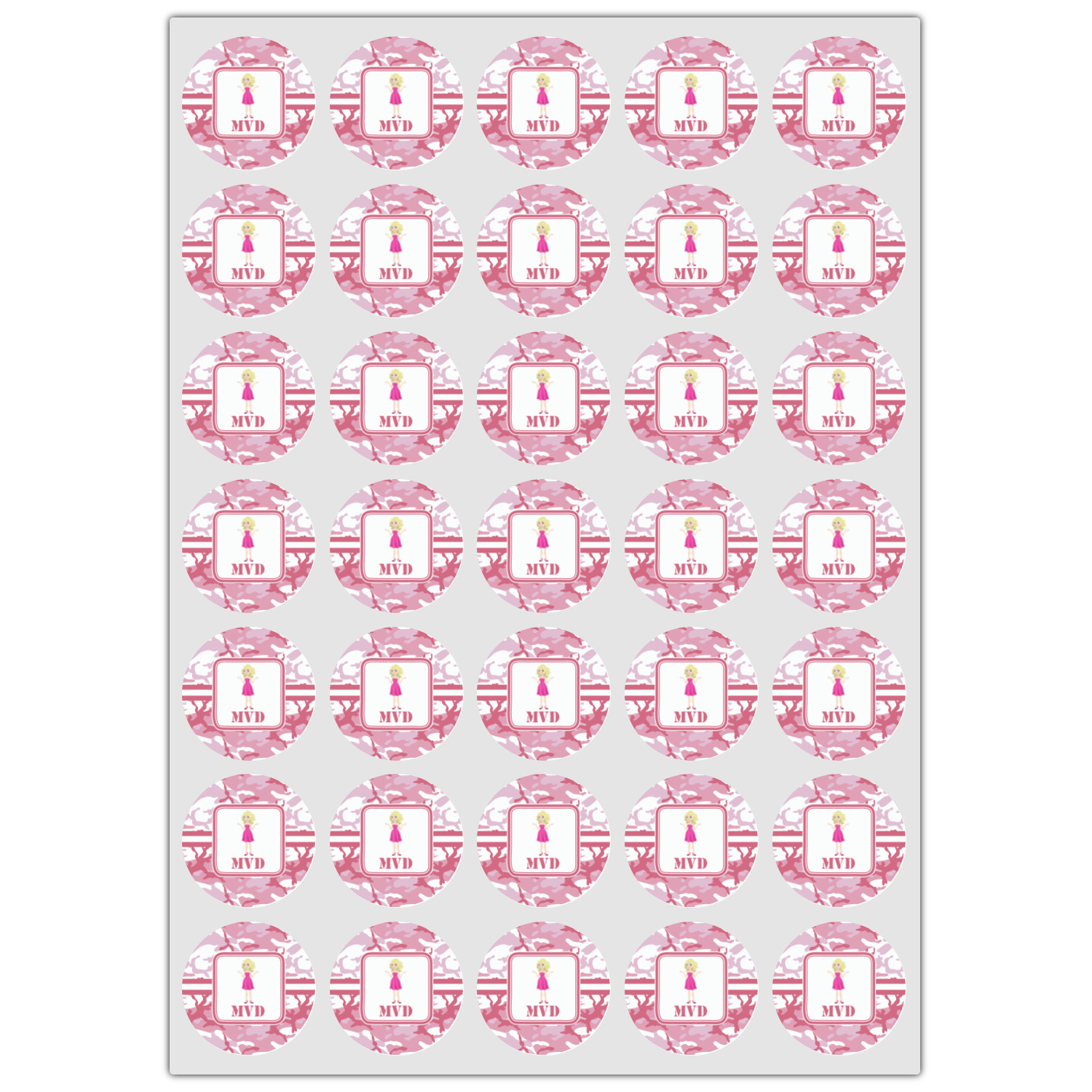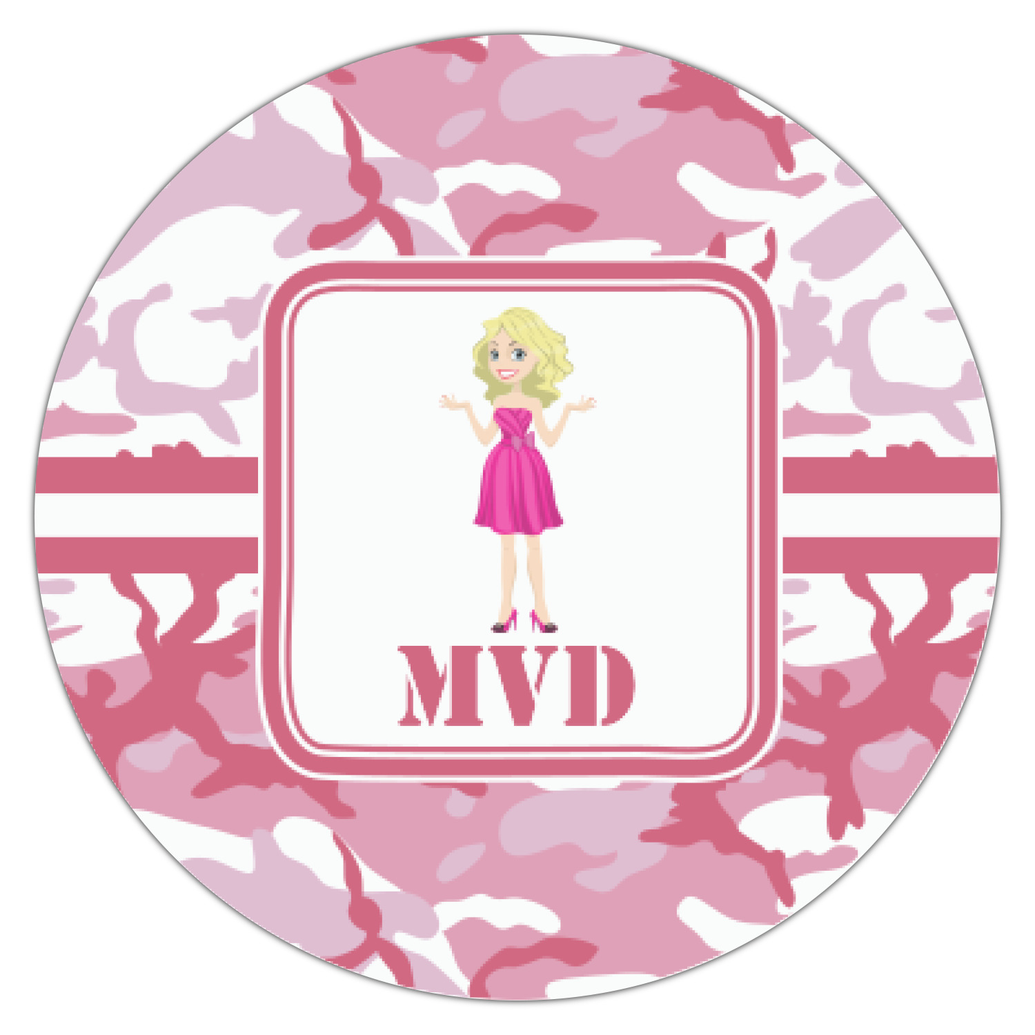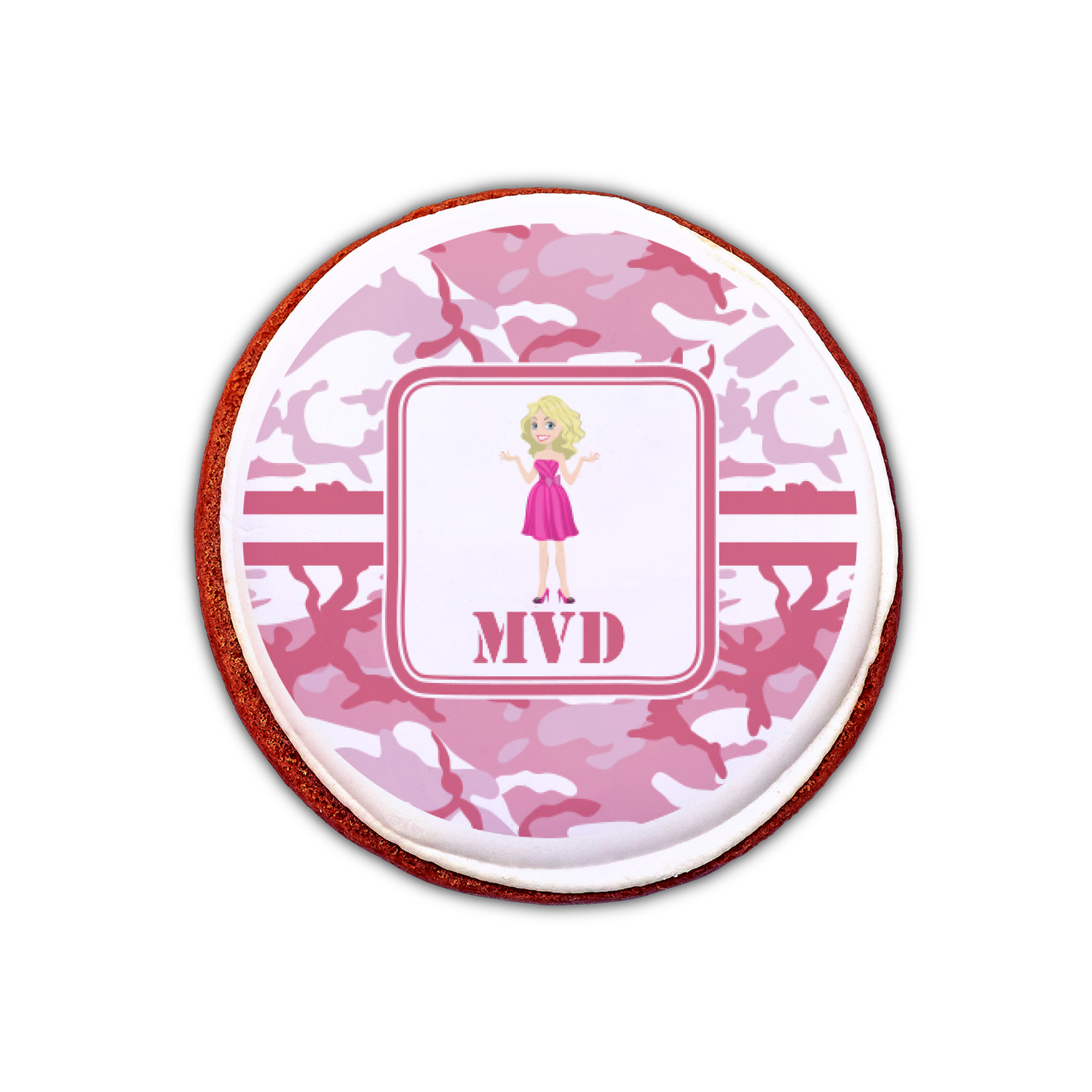 We have featured our little army girl, wearing her pink camo helmet, in the middle of the design in a pink and white square. A wide white band trimmed in pink tie everything together.