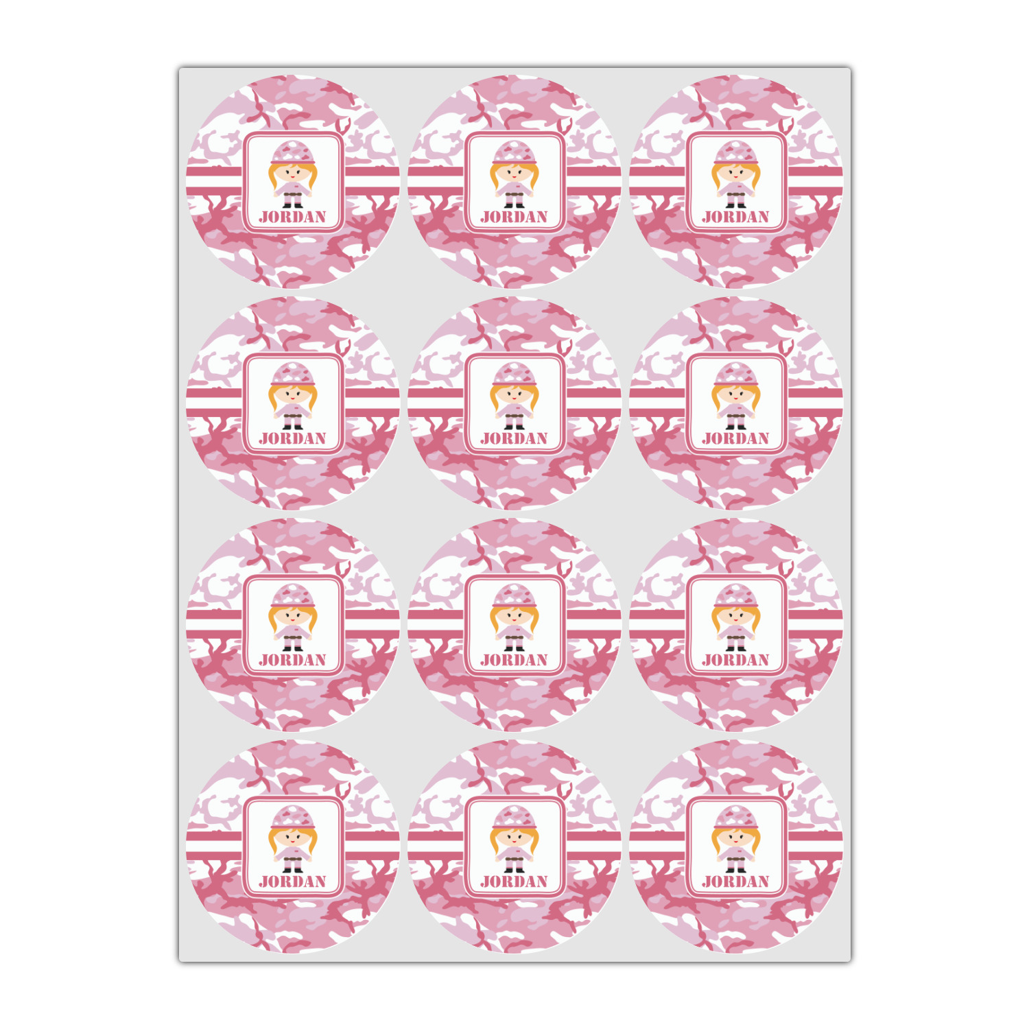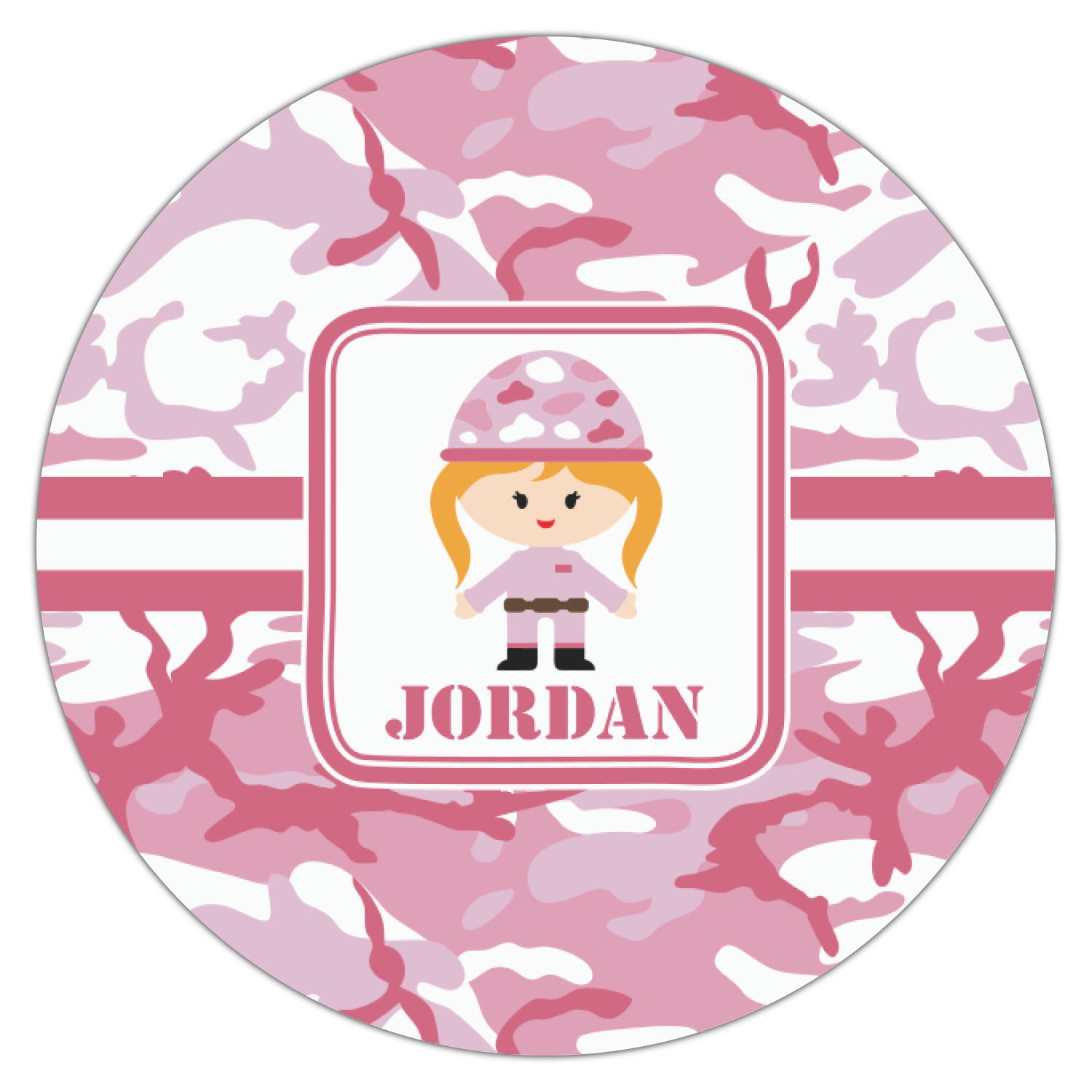We have featured our little army girl, wearing her pink camo helmet, in the middle of the design in a pink and white square. A wide white band trimmed in pink tie everything together.