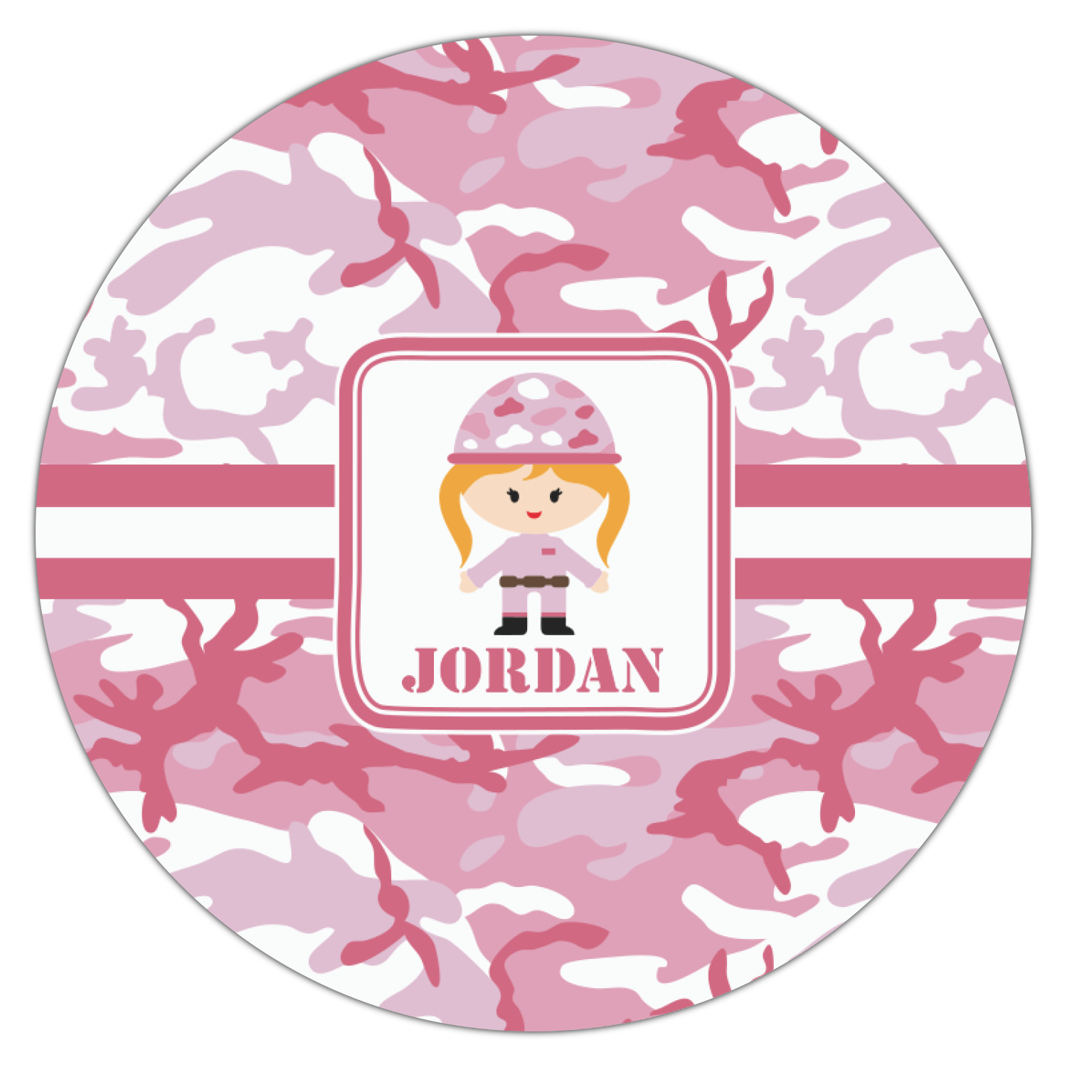 We have featured our little army girl, wearing her pink camo helmet, in the middle of the design in a pink and white square. A wide white band trimmed in pink tie everything together.