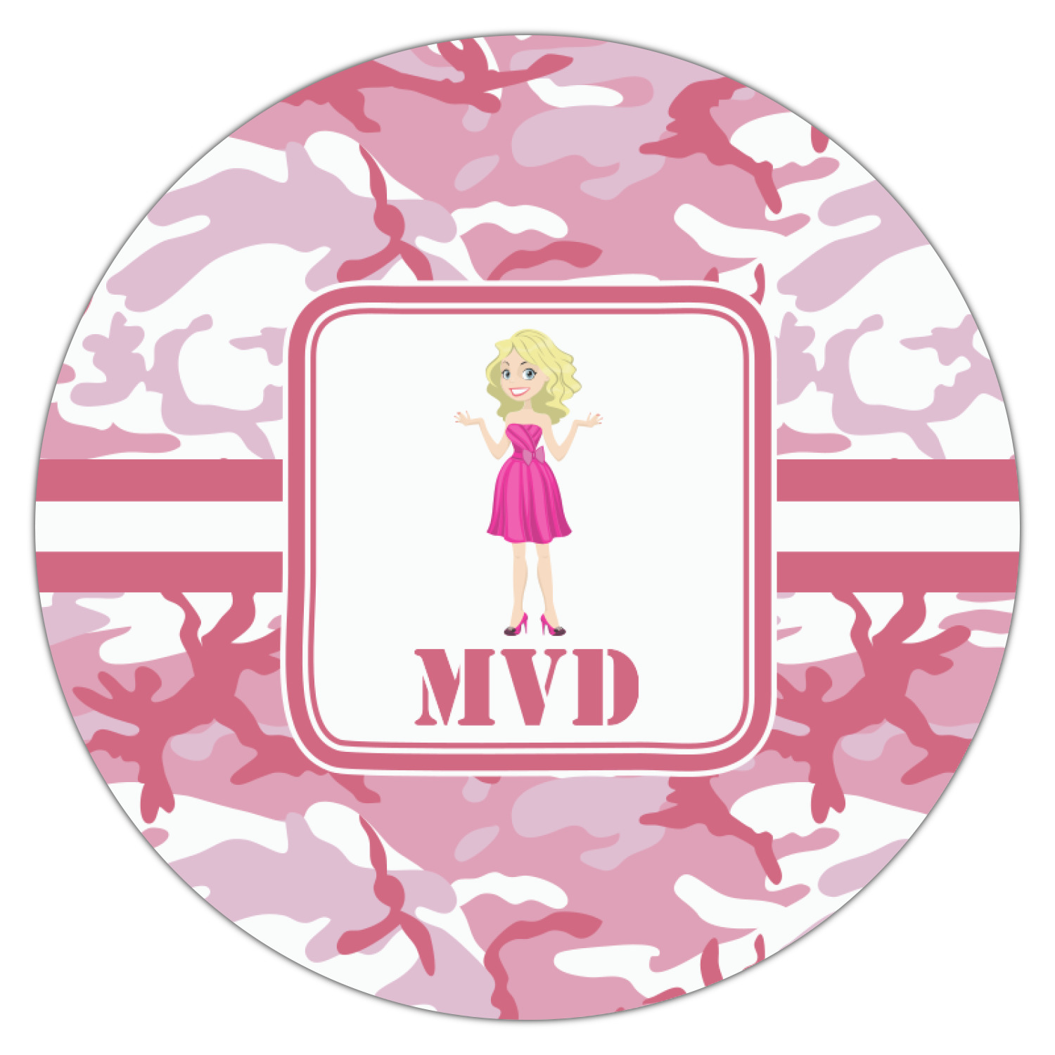 We have featured our little army girl, wearing her pink camo helmet, in the middle of the design in a pink and white square. A wide white band trimmed in pink tie everything together.