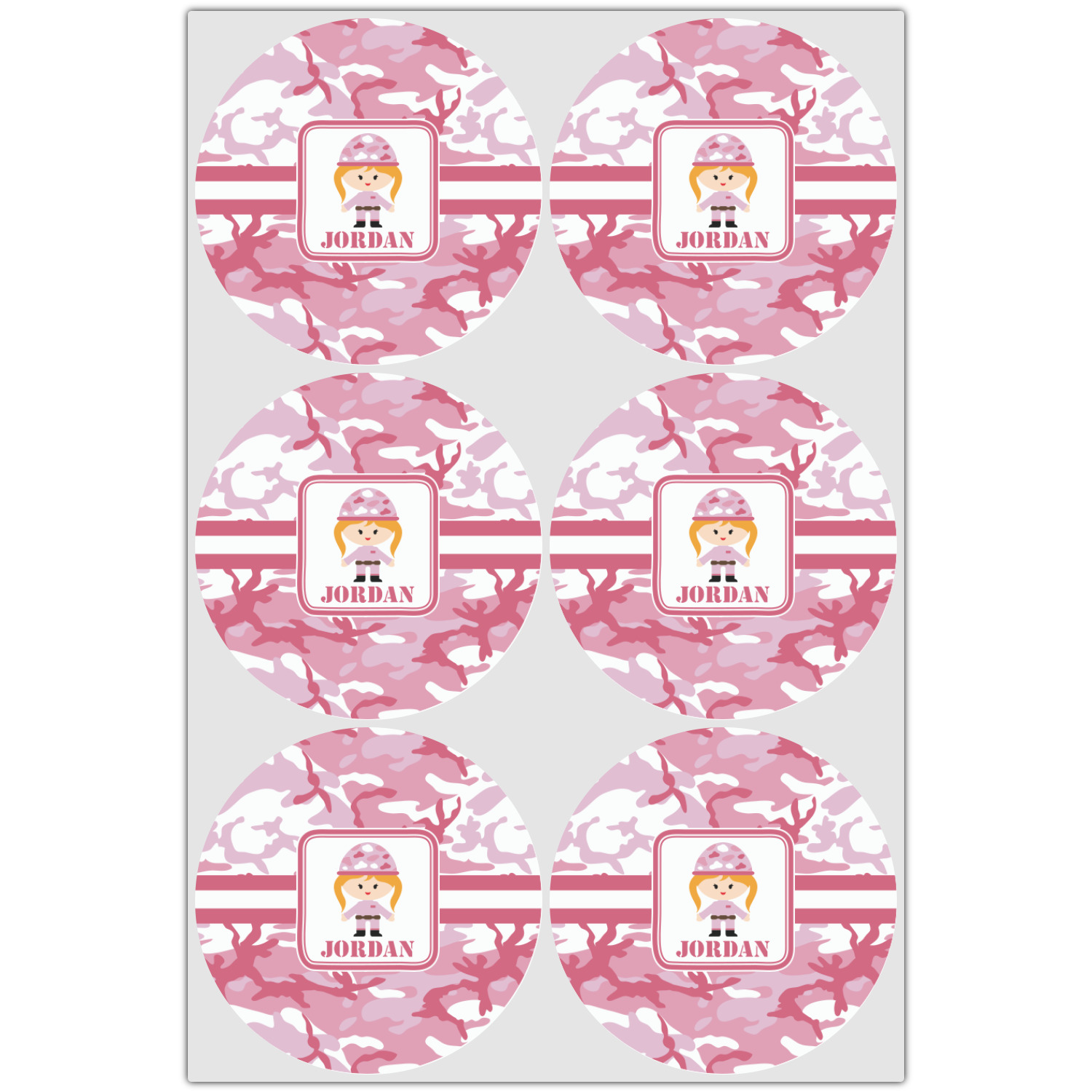 We have featured our little army girl, wearing her pink camo helmet, in the middle of the design in a pink and white square. A wide white band trimmed in pink tie everything together.