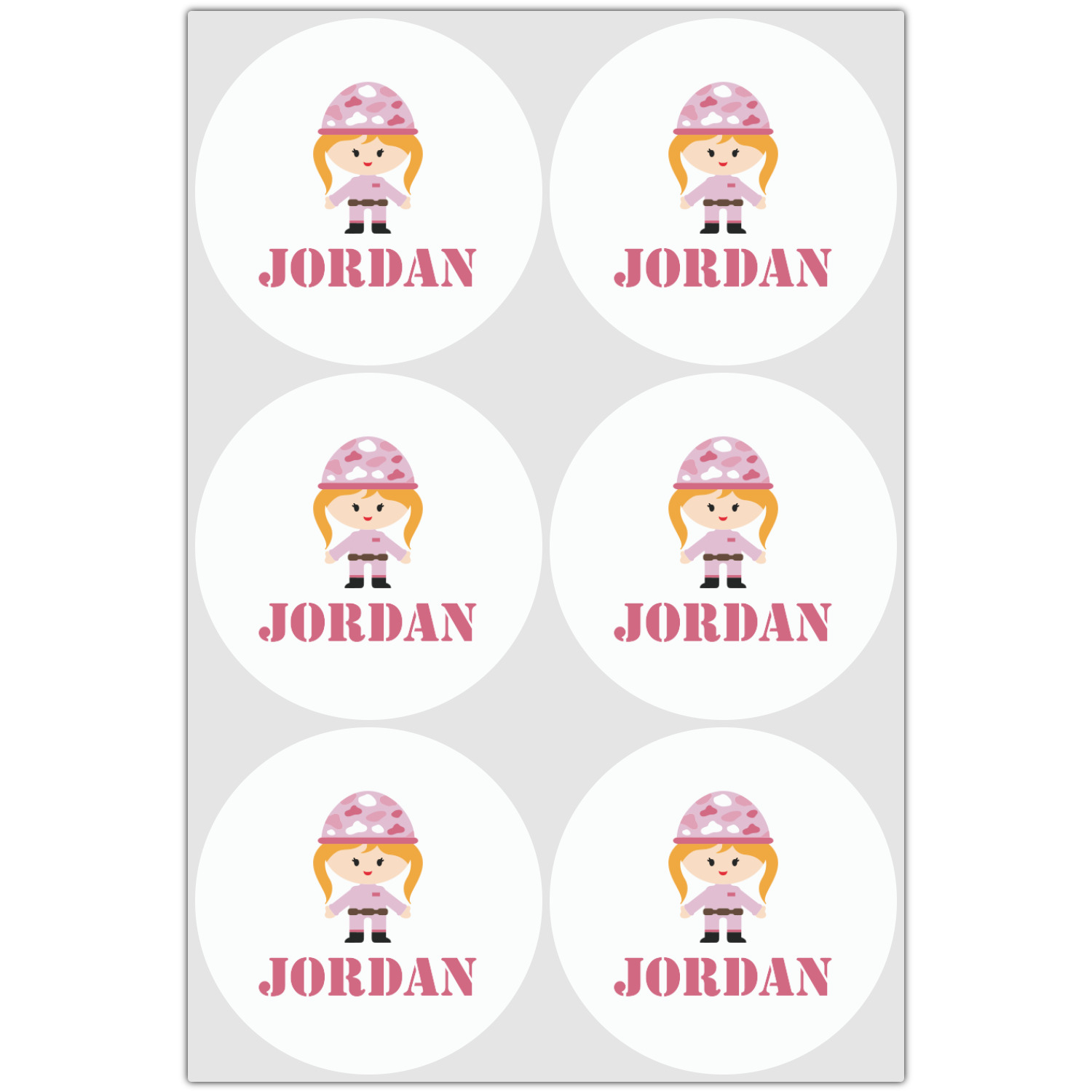 We have featured our little army girl, wearing her pink camo helmet, in the middle of the design in a pink and white square. A wide white band trimmed in pink tie everything together.