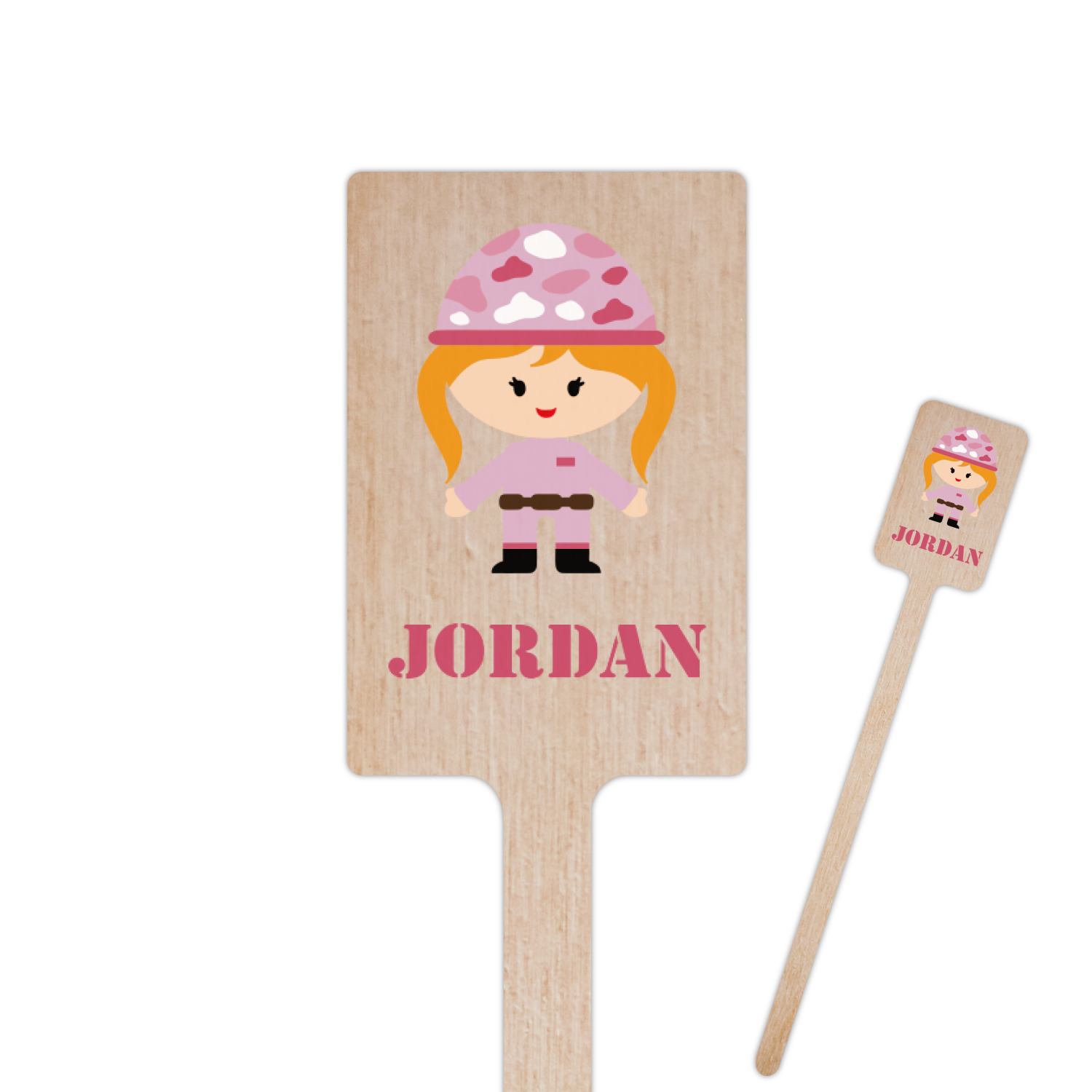 We have featured our little army girl, wearing her pink camo helmet, in the middle of the design in a pink and white square. A wide white band trimmed in pink tie everything together.