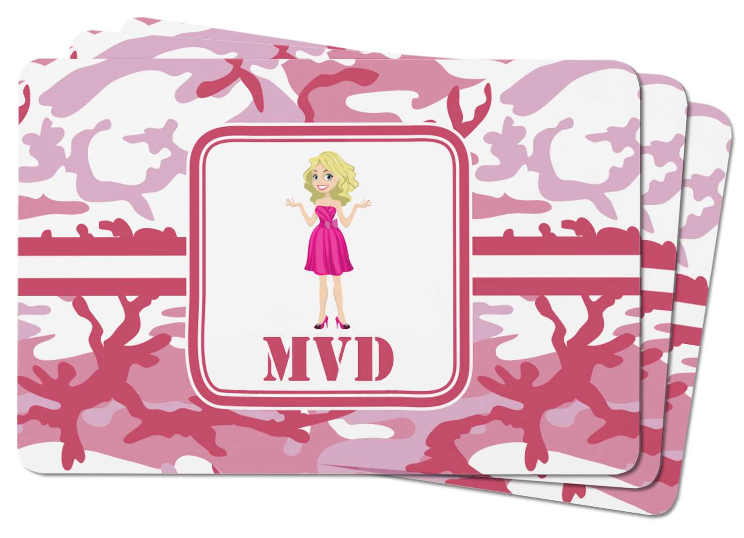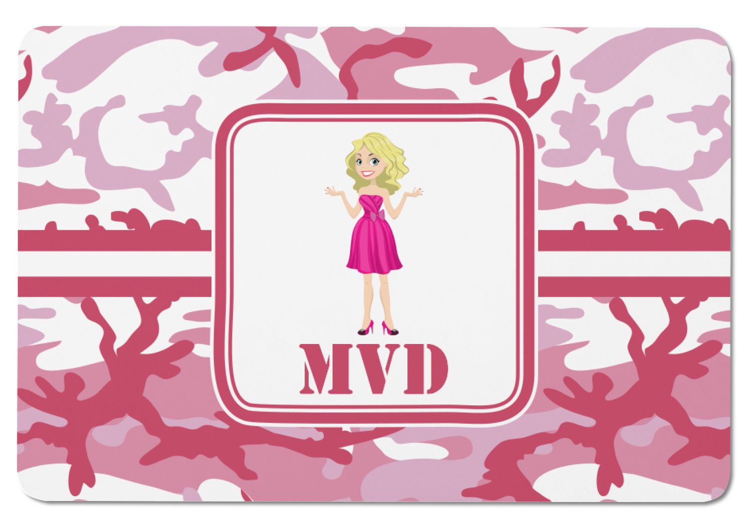We have featured our little army girl, wearing her pink camo helmet, in the middle of the design in a pink and white square. A wide white band trimmed in pink tie everything together.