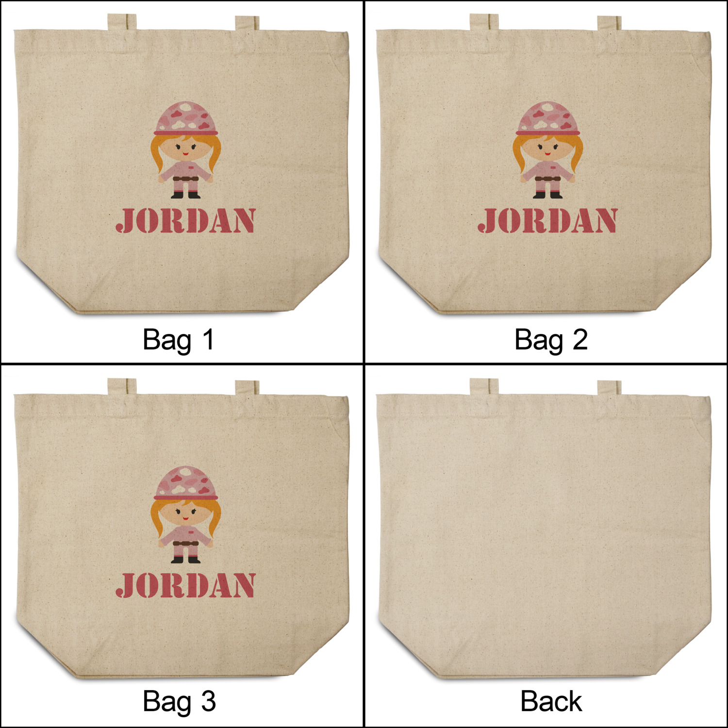 We have featured our little army girl, wearing her pink camo helmet, in the middle of the design in a pink and white square. A wide white band trimmed in pink tie everything together.