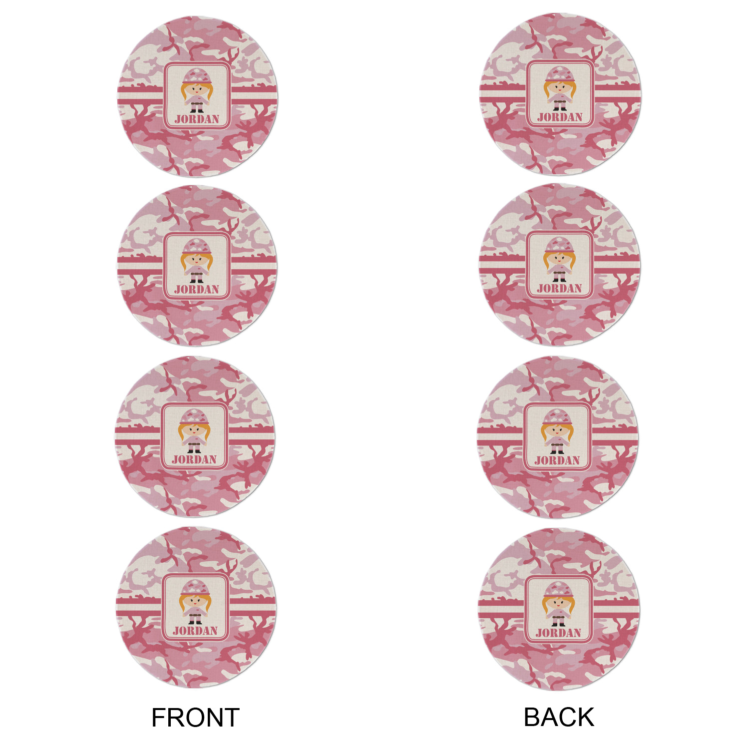 We have featured our little army girl, wearing her pink camo helmet, in the middle of the design in a pink and white square. A wide white band trimmed in pink tie everything together.
