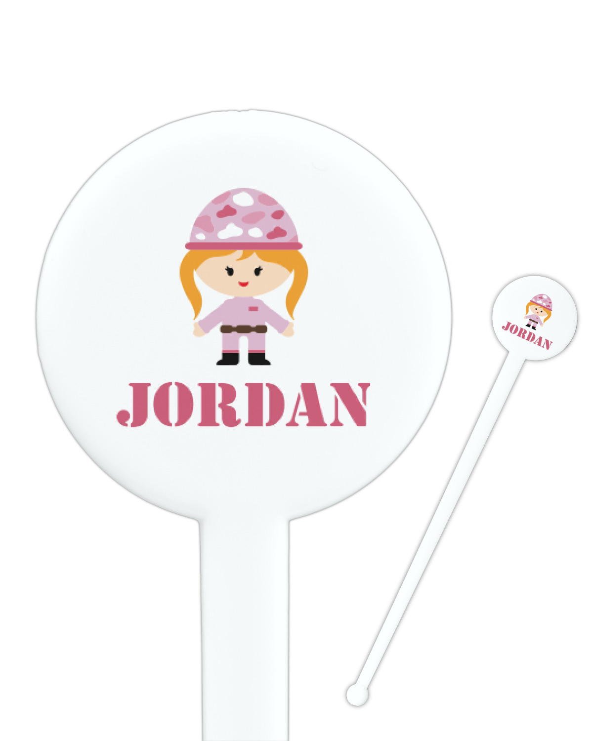 We have featured our little army girl, wearing her pink camo helmet, in the middle of the design in a pink and white square. A wide white band trimmed in pink tie everything together.