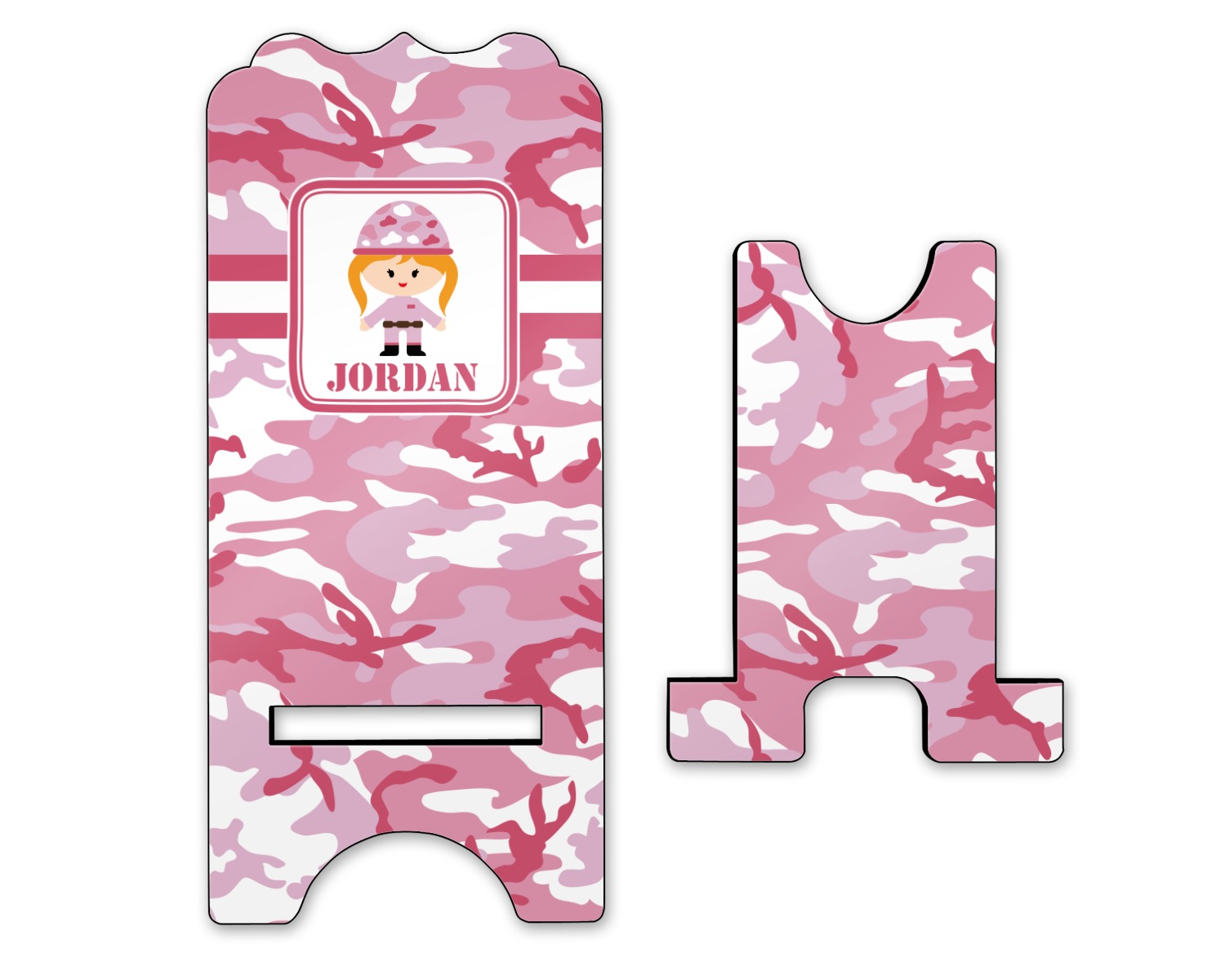 We have featured our little army girl, wearing her pink camo helmet, in the middle of the design in a pink and white square. A wide white band trimmed in pink tie everything together.