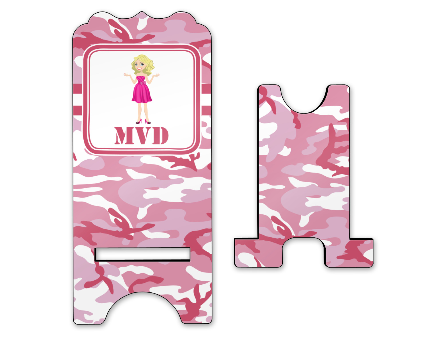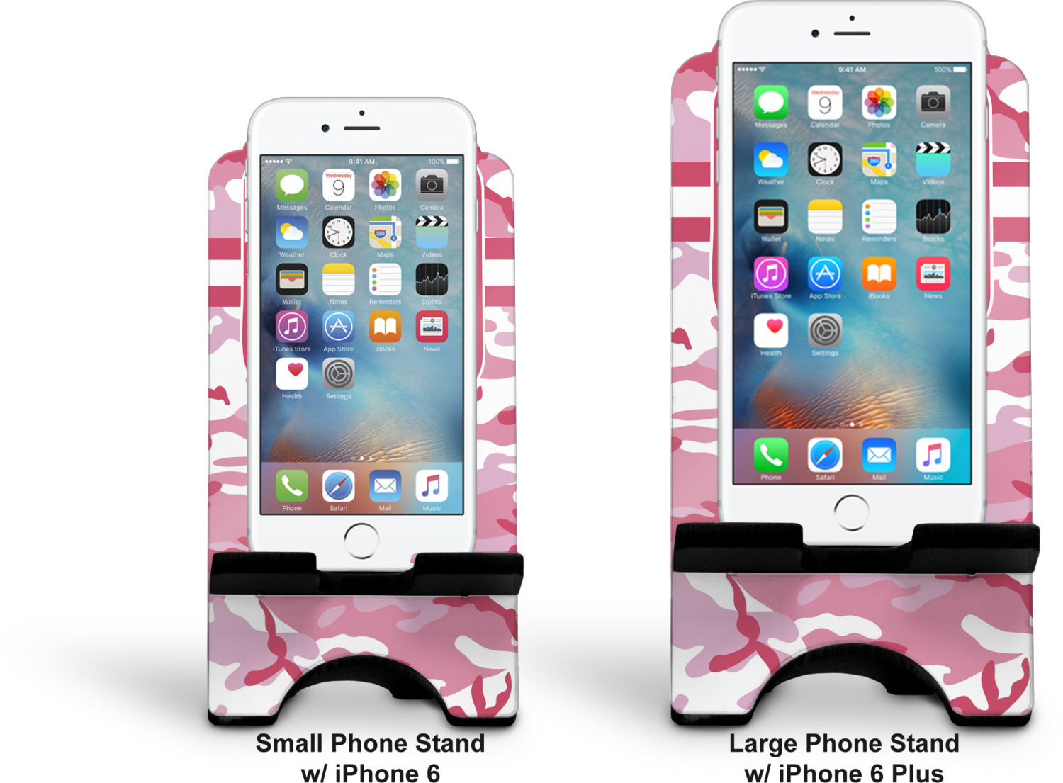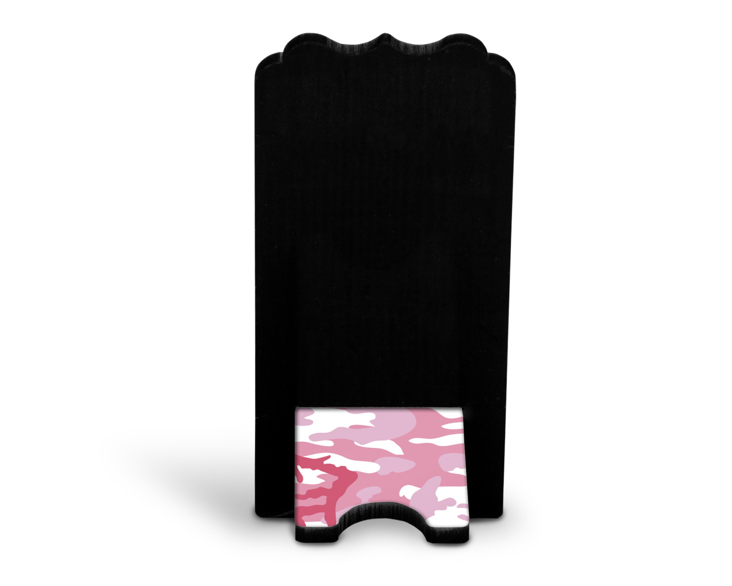 To meet your needs, we offer four variations of this IPhone stand. The backboard of the first version is shaped as a plain, yet sleek rectangle, and is available in two sizes. Our smaller size is approximately 4 by 3.25 by 7 inches, while the larger model is 4 by 3.77 by 8.5 inches. Alongside this model, we also provide you with a more decorative option. The upper part of our second version features a curved edge, for a classy, suave appearance. This phone holder is also sold in two sizes: a smaller version, which is 4 by 3.25 by 7 inches, and our larger model, which is 4 by 3.77 by 8.5 inches. Both models will support large phones, but the larger model is better if you wish to proudly display your personalized design.