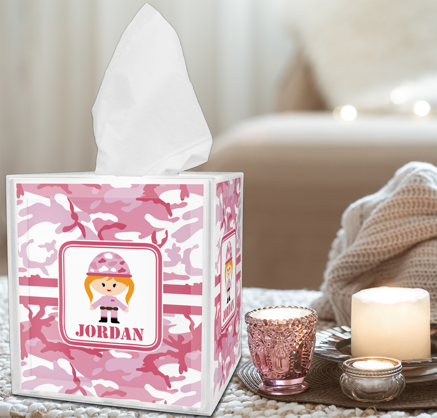 These tissue holders are built from durable acrylic and display your unique personalization on fine-quality vinyl inserts placed within the four sides and top. The box features two pieces, allowing you to easily switch out tissue boxes. On the sides, youll find ridges that ensure the top and base fit securely in place. The bottom of these tissue box holders has four, rubber, non-slip pads to prevent the box from scuffing any surface you decide to display it on. Each box can fit a standard 5 by 5-inch box of tissues.