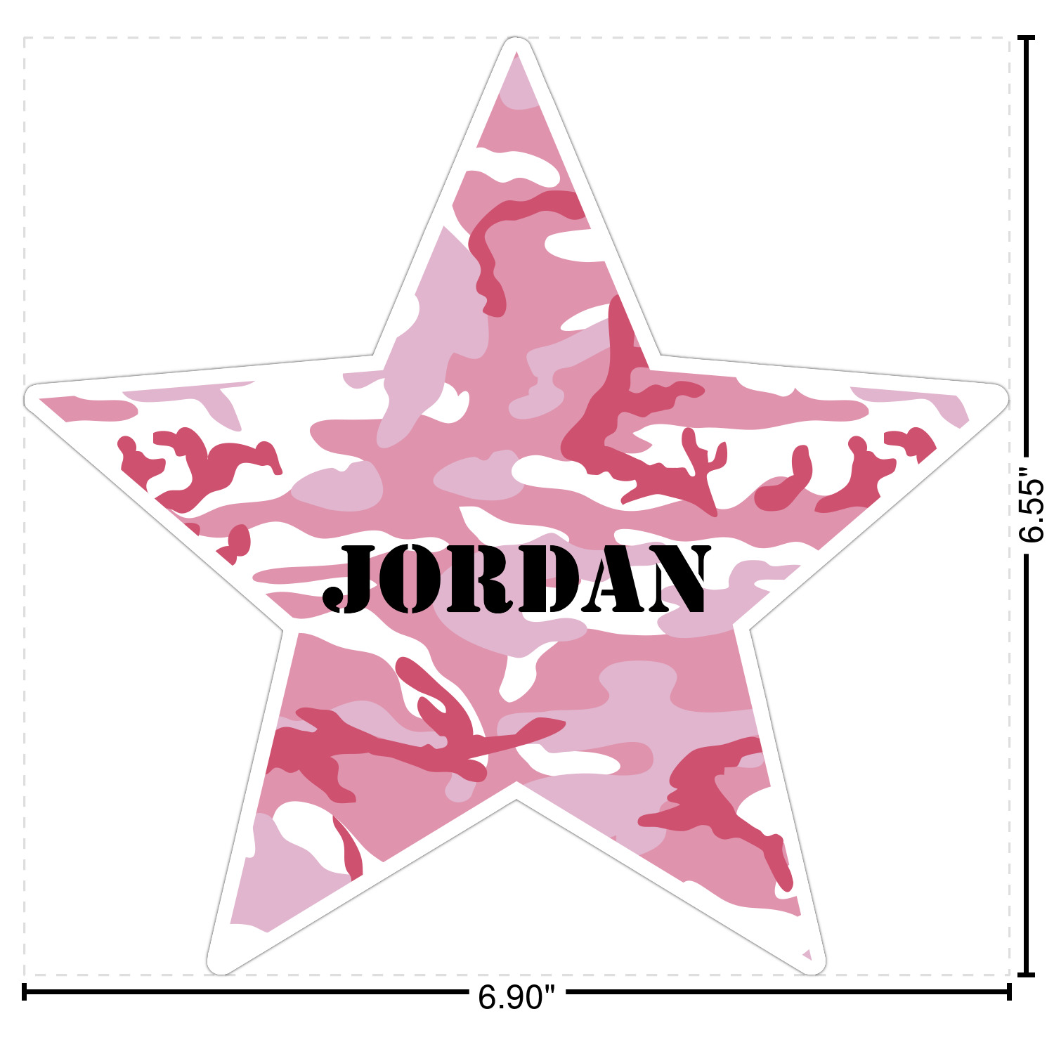 We have featured our little army girl, wearing her pink camo helmet, in the middle of the design in a pink and white square. A wide white band trimmed in pink tie everything together.