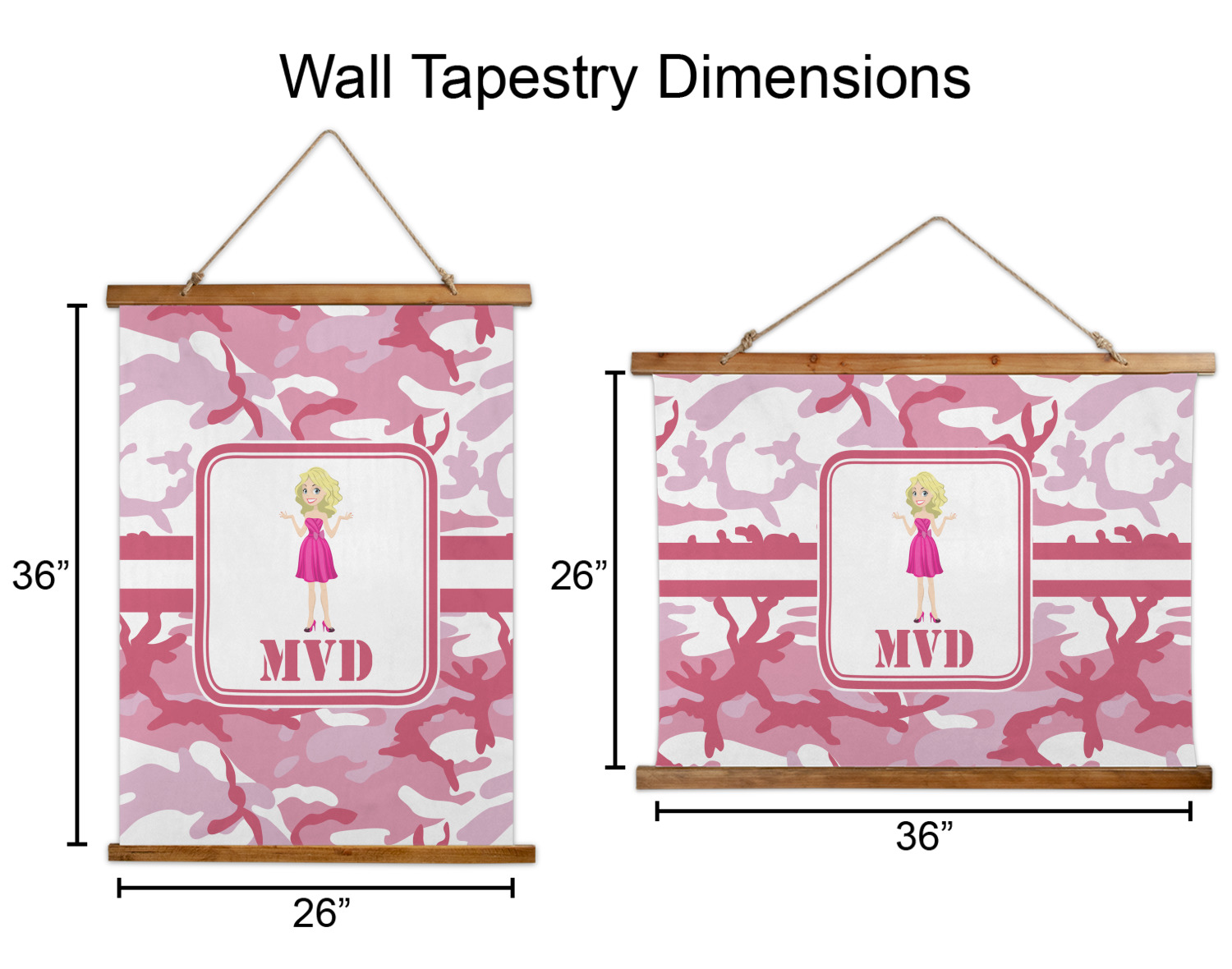Made in two different orientations - portrait or landscape - both are 26" x 36". Your design is printed on a high quality polyester fabric with hemmed edges. The wood on the top and bottom of the tapestry is 1.25" tall and 0.25" thick and there are two pieces on top and bottom which sandwich the fabric.