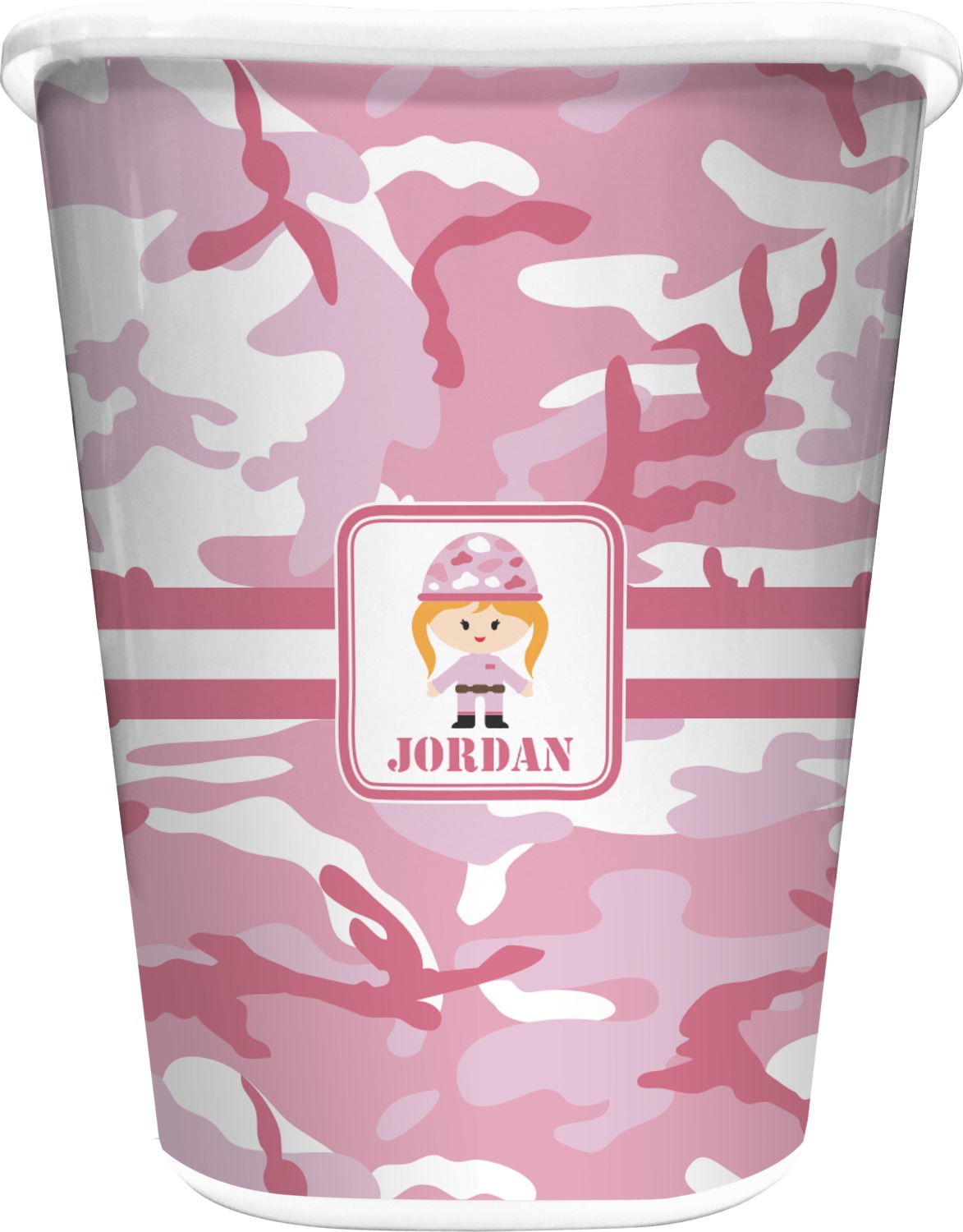 We have featured our little army girl, wearing her pink camo helmet, in the middle of the design in a pink and white square. A wide white band trimmed in pink tie everything together.