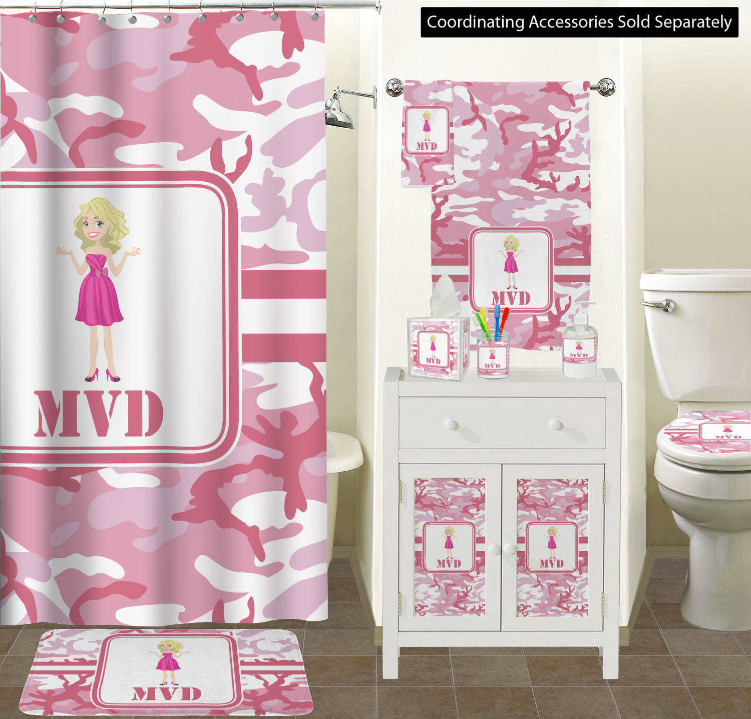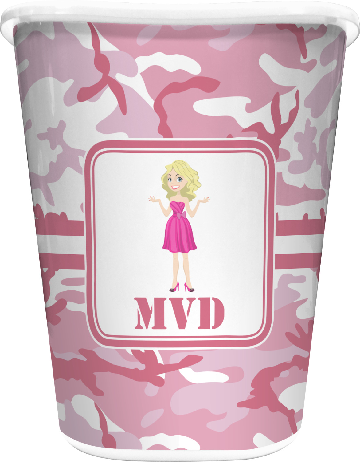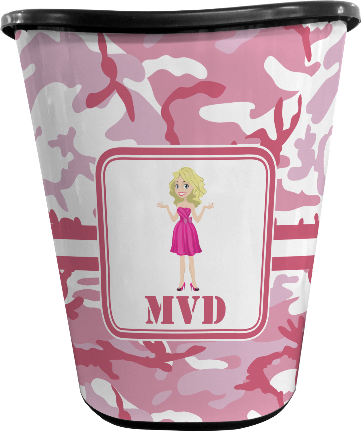 We have featured our little army girl, wearing her pink camo helmet, in the middle of the design in a pink and white square. A wide white band trimmed in pink tie everything together.