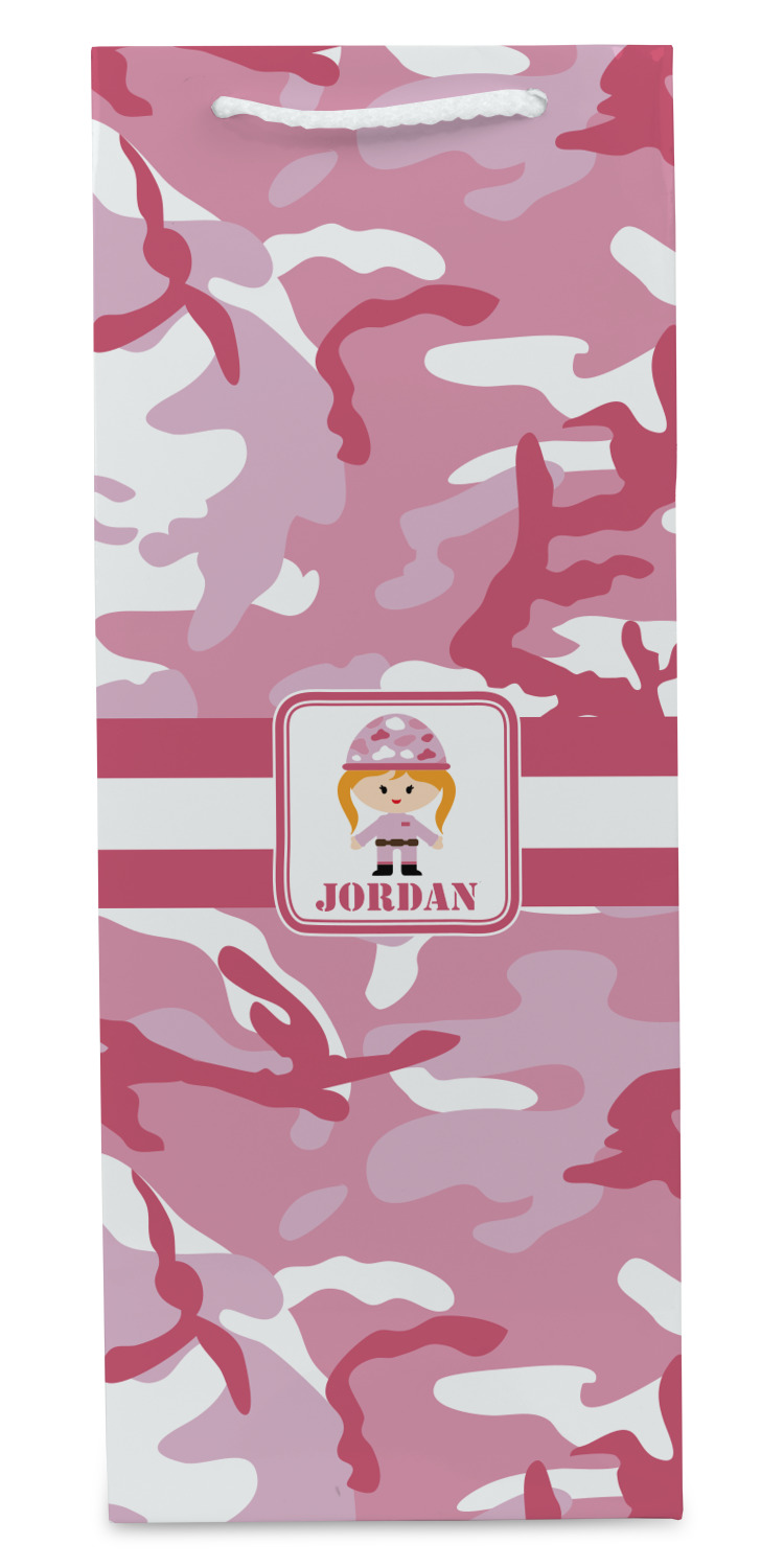 We have featured our little army girl, wearing her pink camo helmet, in the middle of the design in a pink and white square. A wide white band trimmed in pink tie everything together.