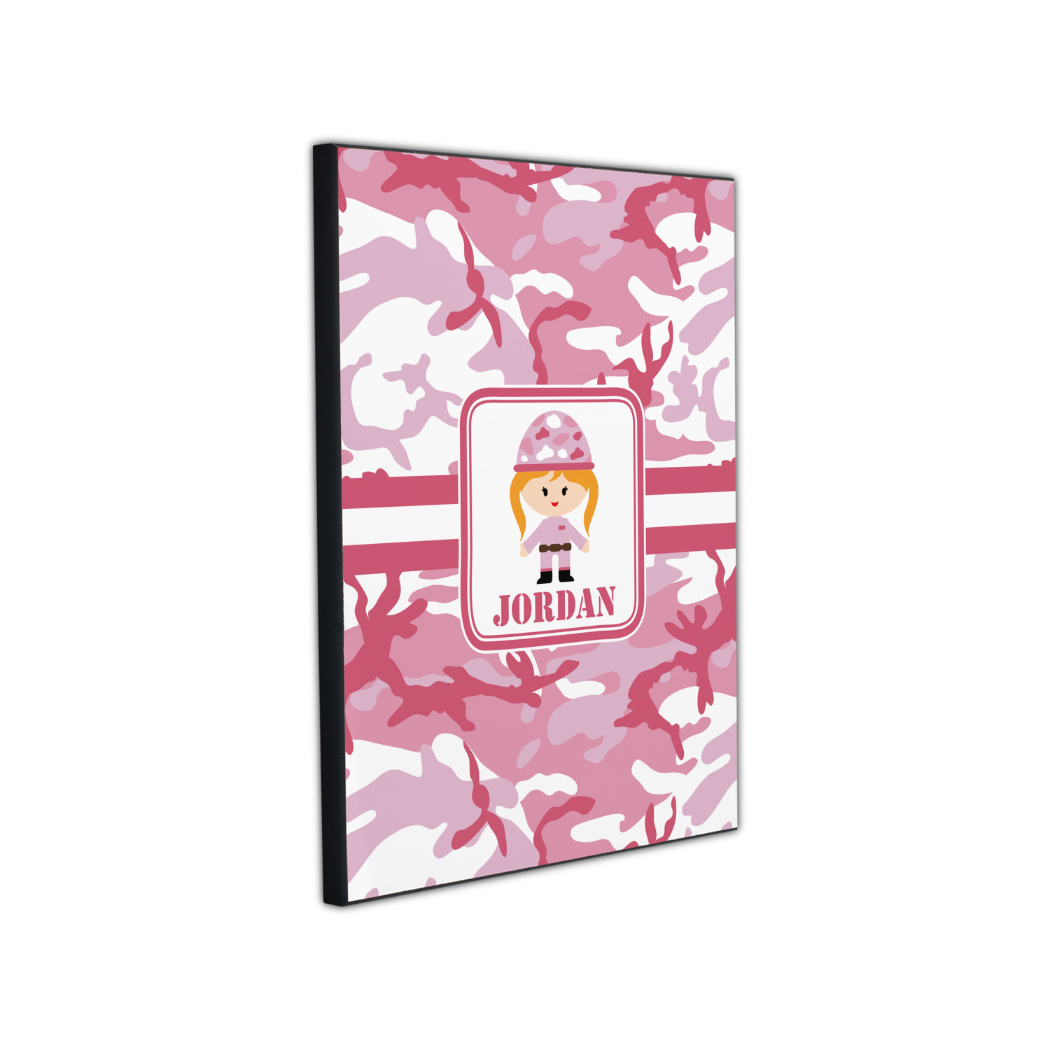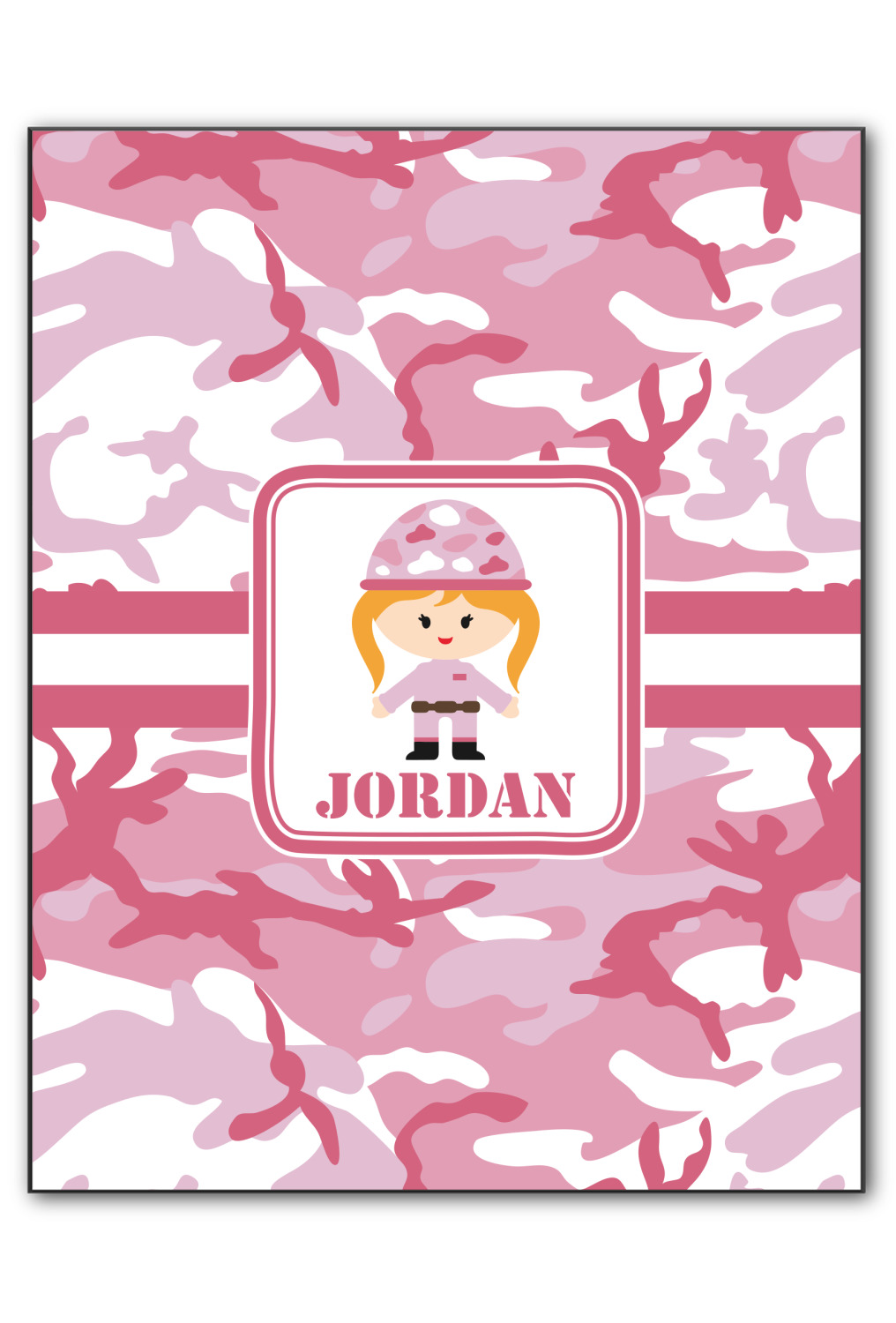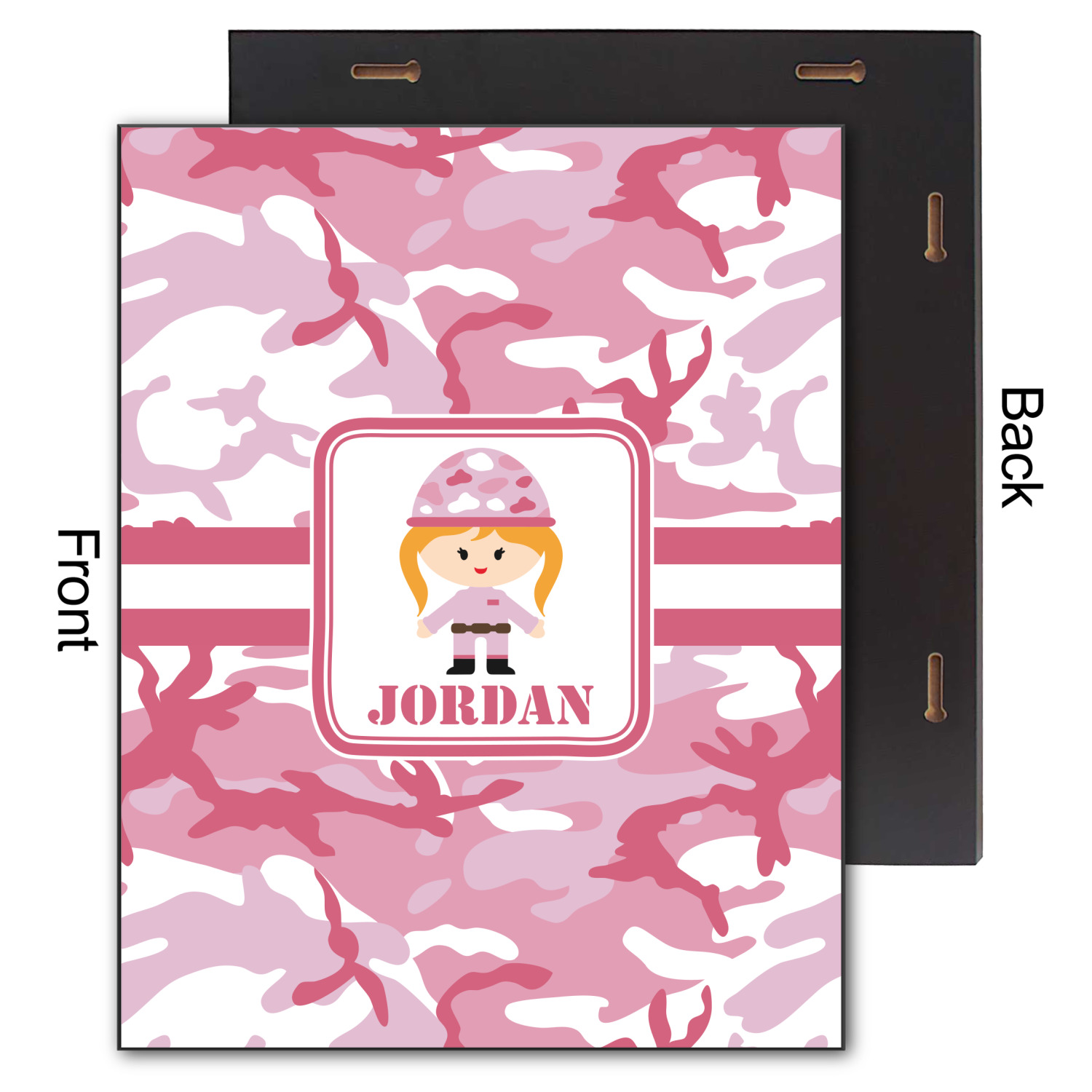 We have featured our little army girl, wearing her pink camo helmet, in the middle of the design in a pink and white square. A wide white band trimmed in pink tie everything together.
