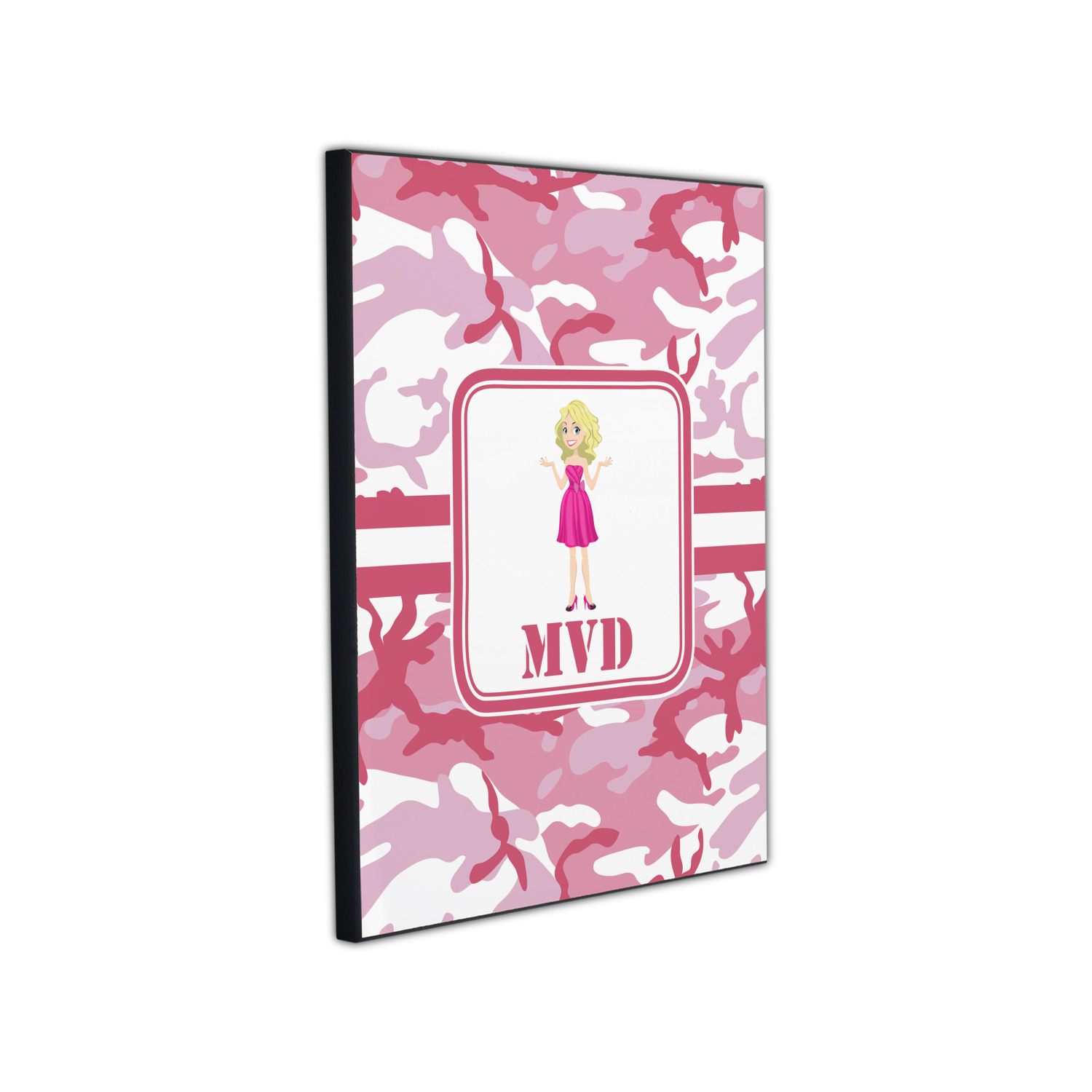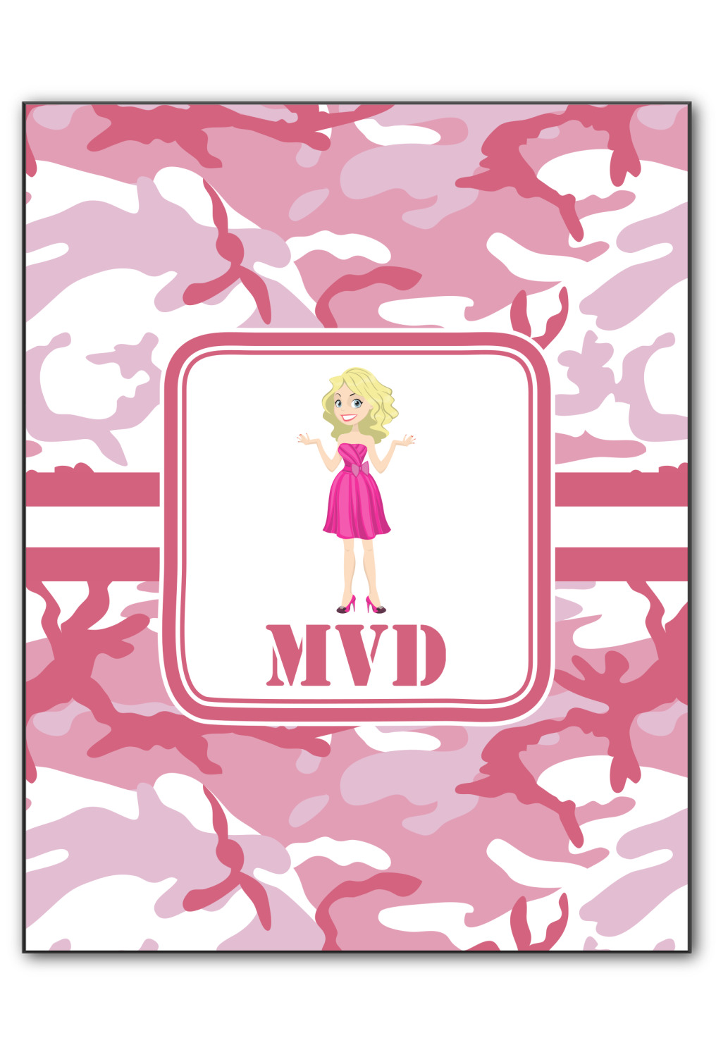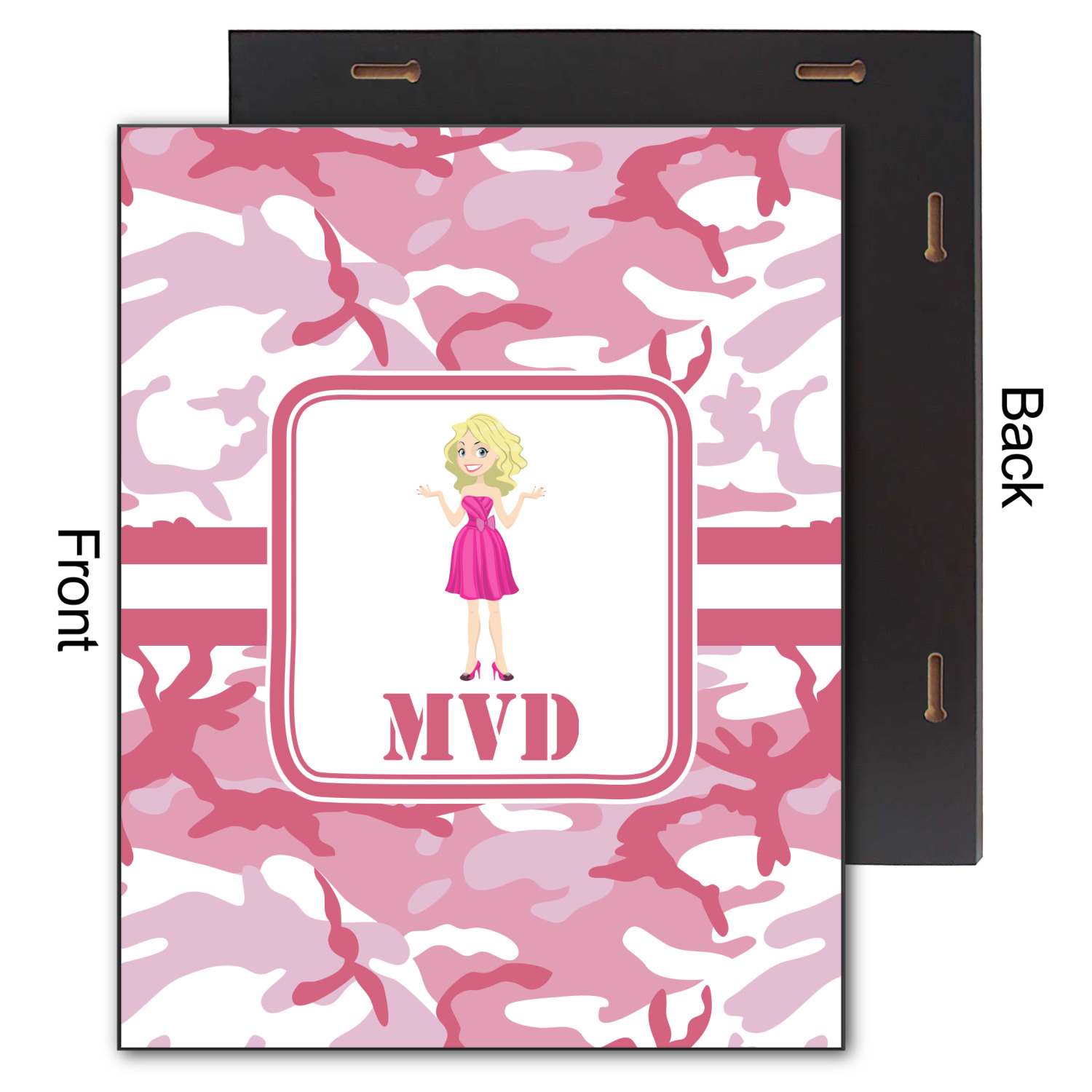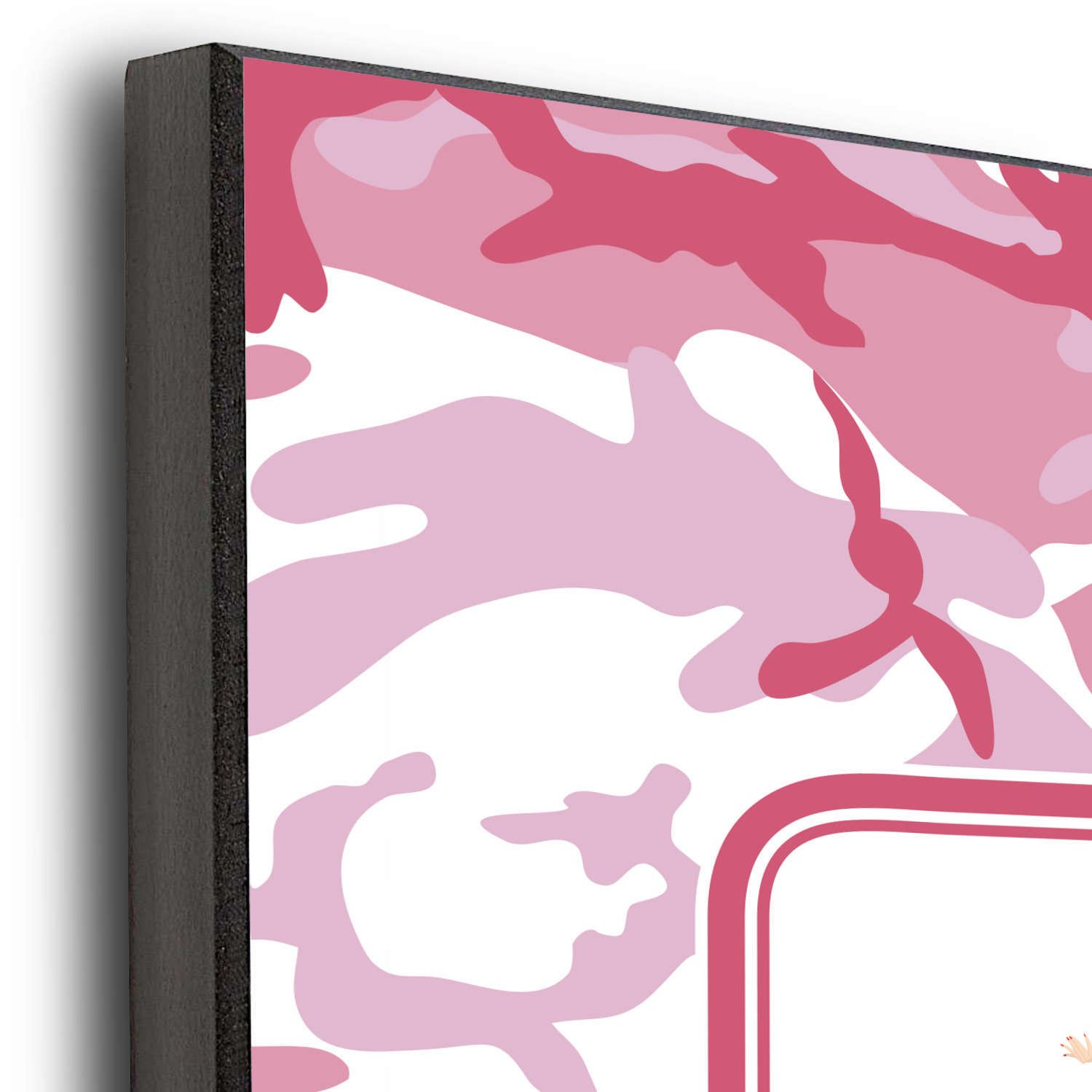 We have featured our little army girl, wearing her pink camo helmet, in the middle of the design in a pink and white square. A wide white band trimmed in pink tie everything together.