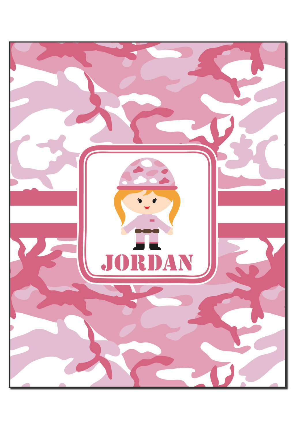 We have featured our little army girl, wearing her pink camo helmet, in the middle of the design in a pink and white square. A wide white band trimmed in pink tie everything together.
