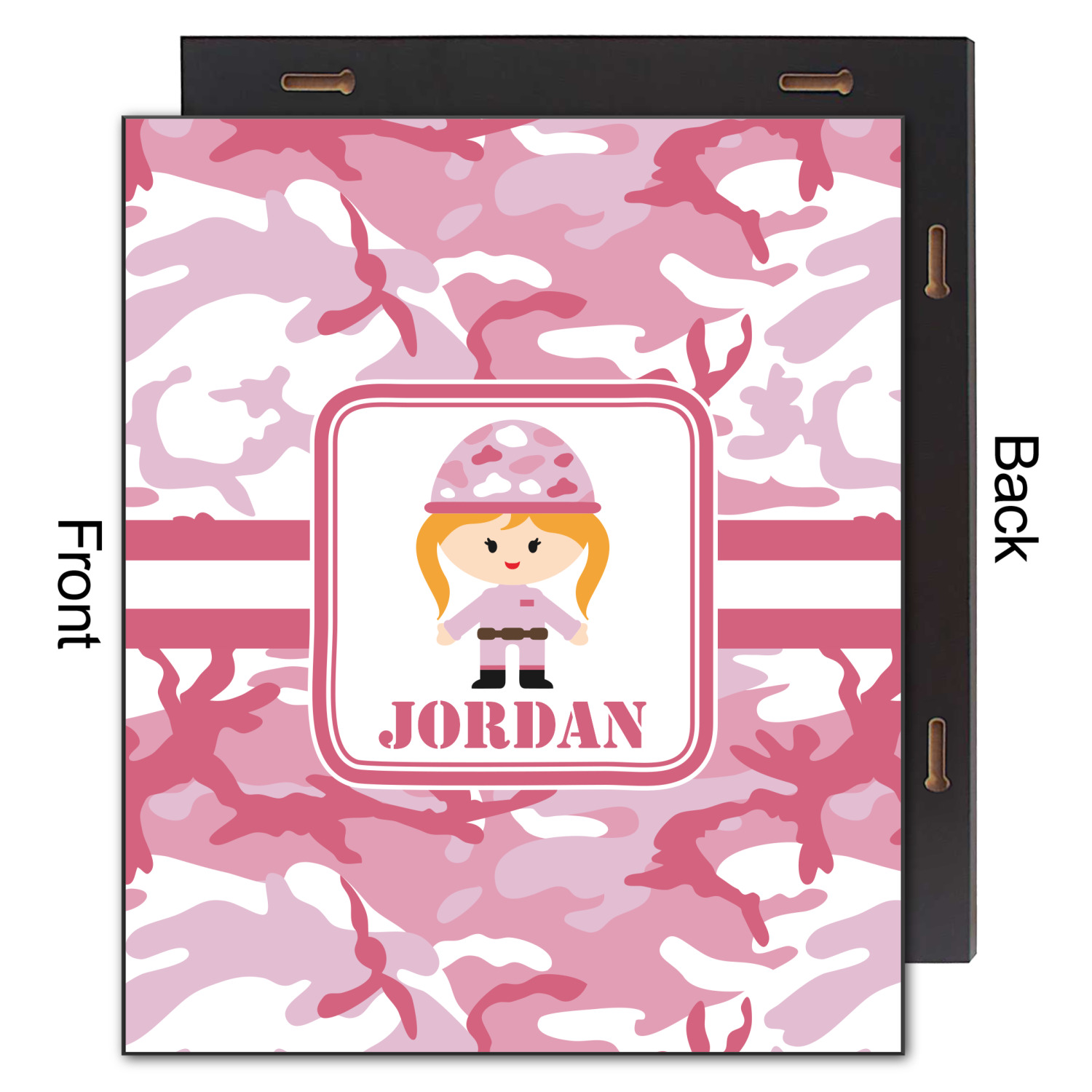 We have featured our little army girl, wearing her pink camo helmet, in the middle of the design in a pink and white square. A wide white band trimmed in pink tie everything together.