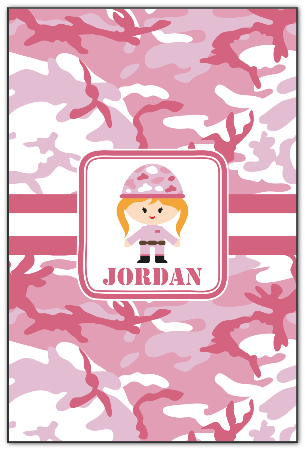 We have featured our little army girl, wearing her pink camo helmet, in the middle of the design in a pink and white square. A wide white band trimmed in pink tie everything together.