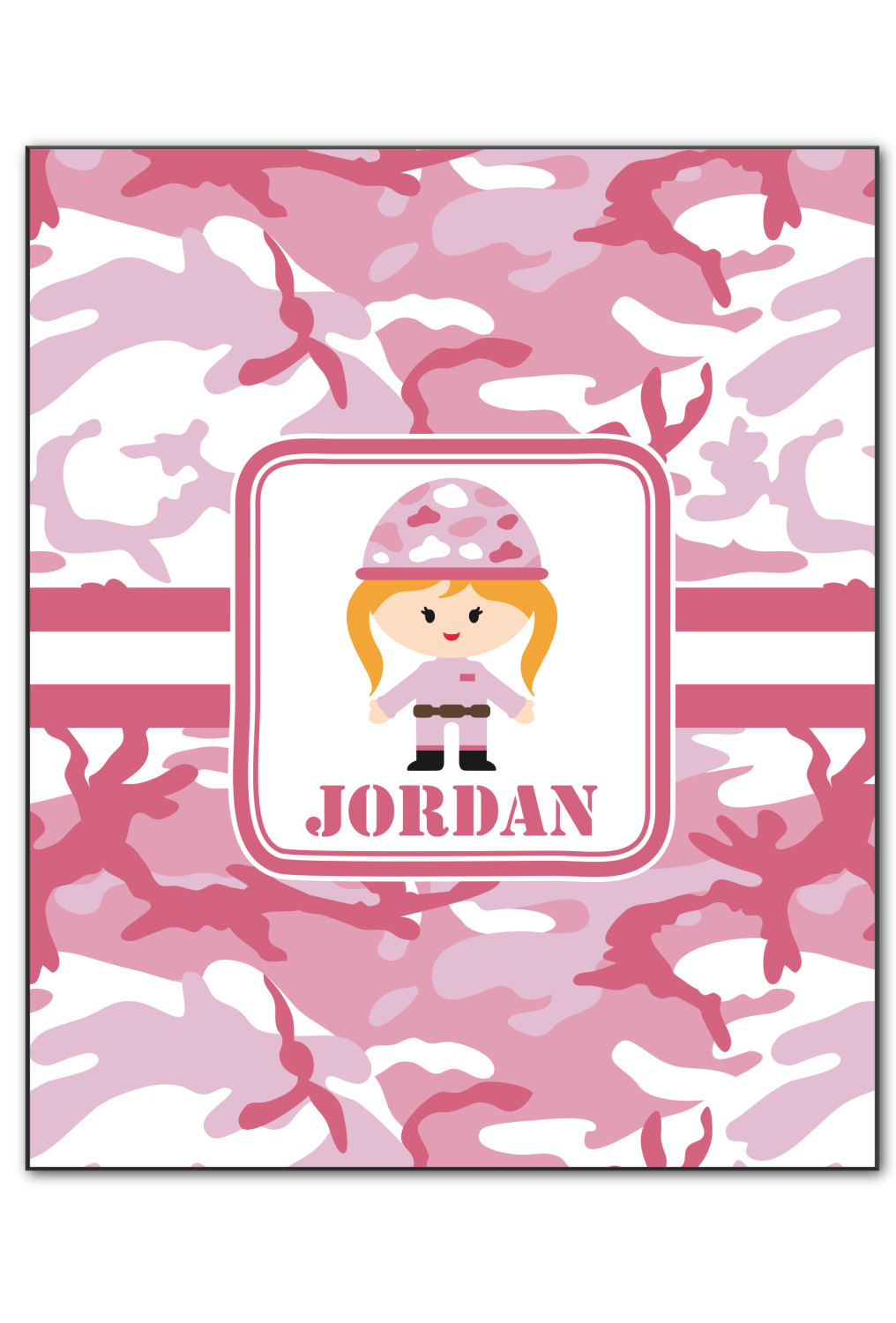 We have featured our little army girl, wearing her pink camo helmet, in the middle of the design in a pink and white square. A wide white band trimmed in pink tie everything together.