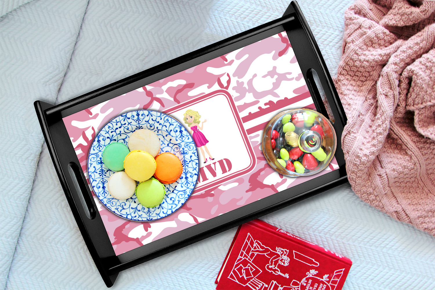 This serving tray with handles features square edges and two rounded sides, creating a very modern look. Each side is fabricated from a beautifully cut, natural wood. The bottom of the interior of the tray displays your customized design in bright, vibrant color. The tray is sold in both a black color and a natural wood look. Each variation of the wood serving tray has two sizes: Small, which is 14" x 10" x 2.25", and Large, which is 19.5" x 13.5" x 2.75".