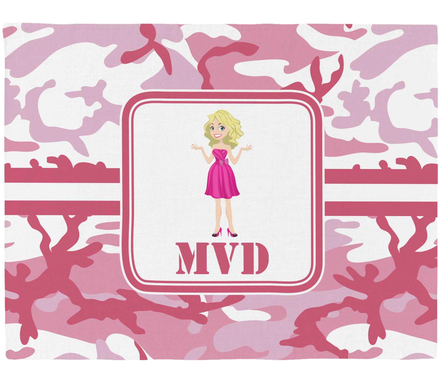 We have featured our little army girl, wearing her pink camo helmet, in the middle of the design in a pink and white square. A wide white band trimmed in pink tie everything together.