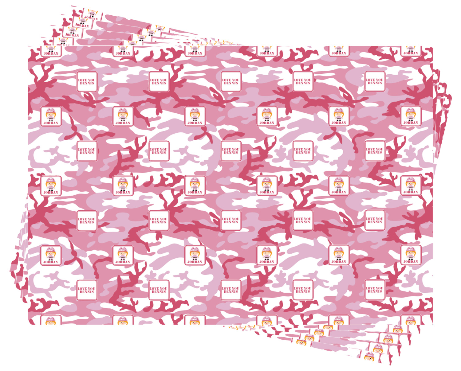 We have featured our little army girl, wearing her pink camo helmet, in the middle of the design in a pink and white square. A wide white band trimmed in pink tie everything together.