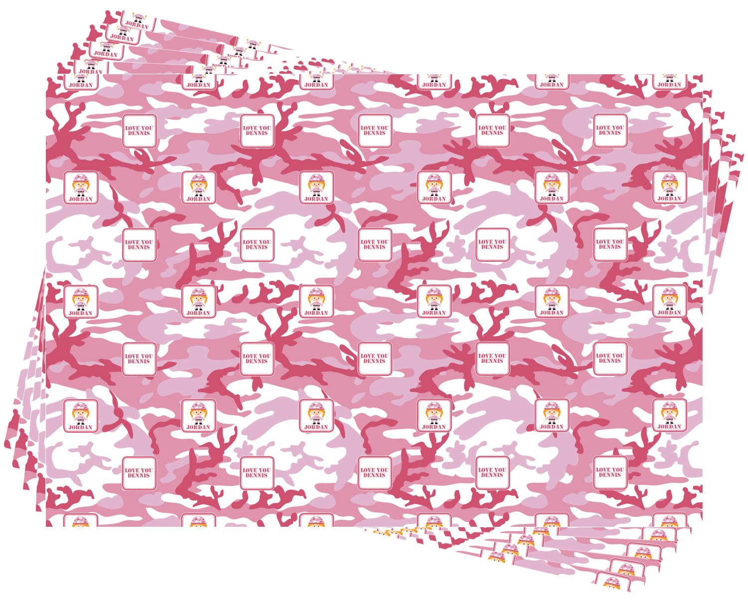 We have featured our little army girl, wearing her pink camo helmet, in the middle of the design in a pink and white square. A wide white band trimmed in pink tie everything together.