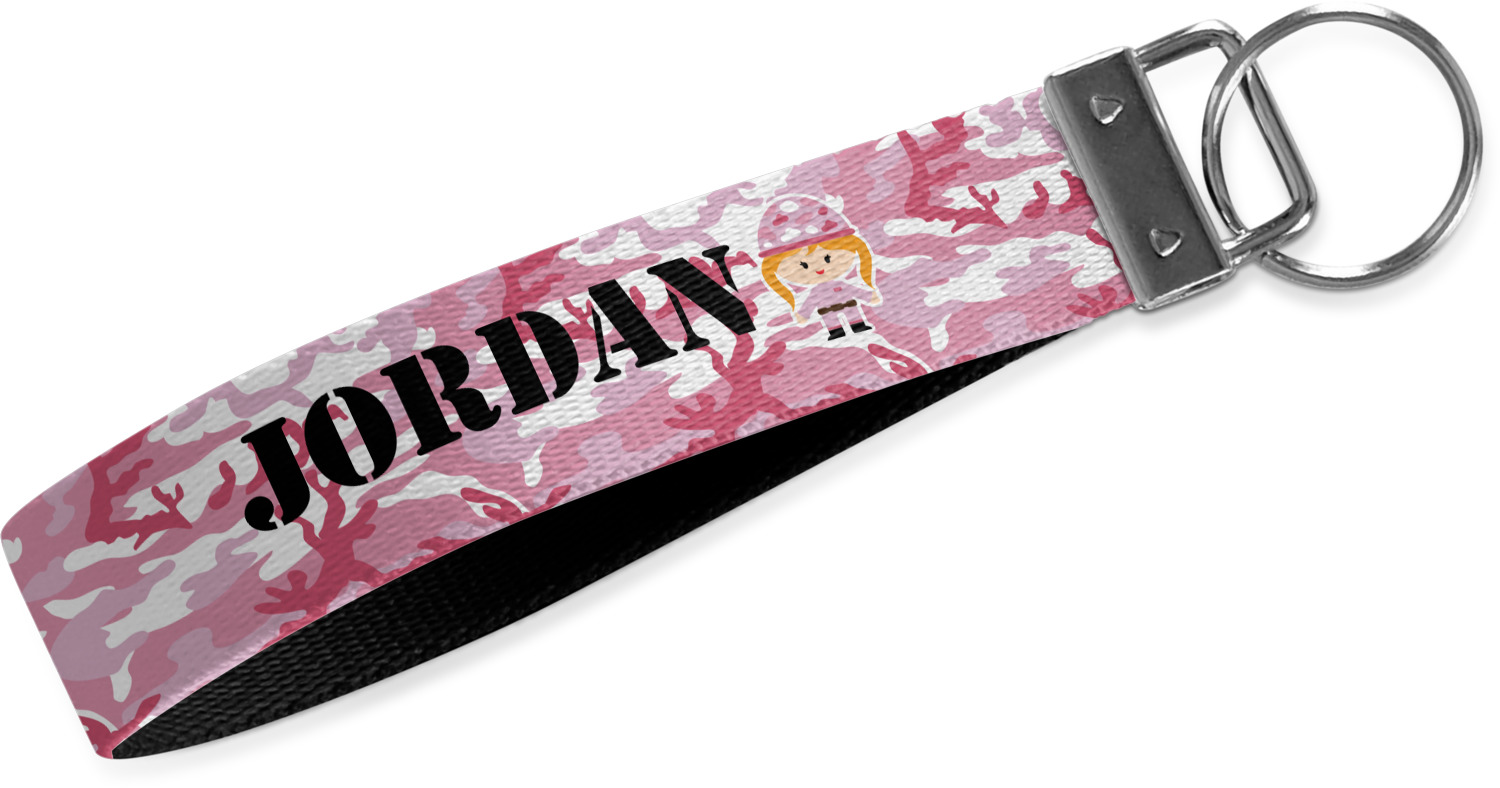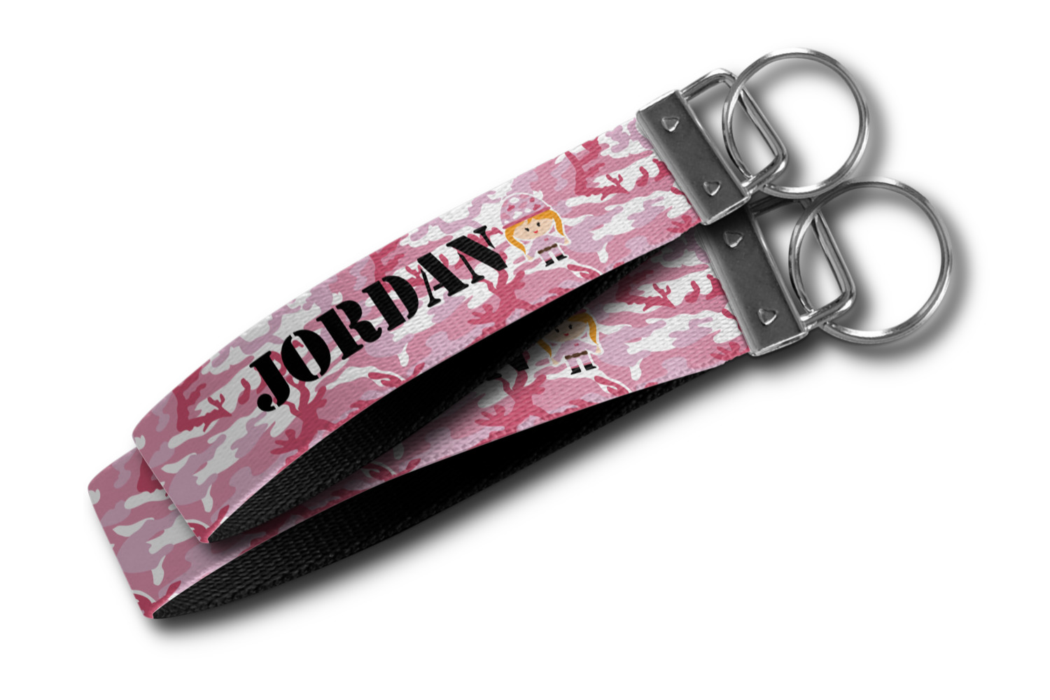 These key fob keychains are made from a polyester weave, right here in the USA. They feature a silver, metal clasp, attached to a round keyring. The piece gives the personalized wristlet a beautiful, finished look. Your customized design is printed on the outside of the keychain strap. We carry these wristlets in two sizes: small, which is 5 inches in width, and large, which is 5.5 inches in width.