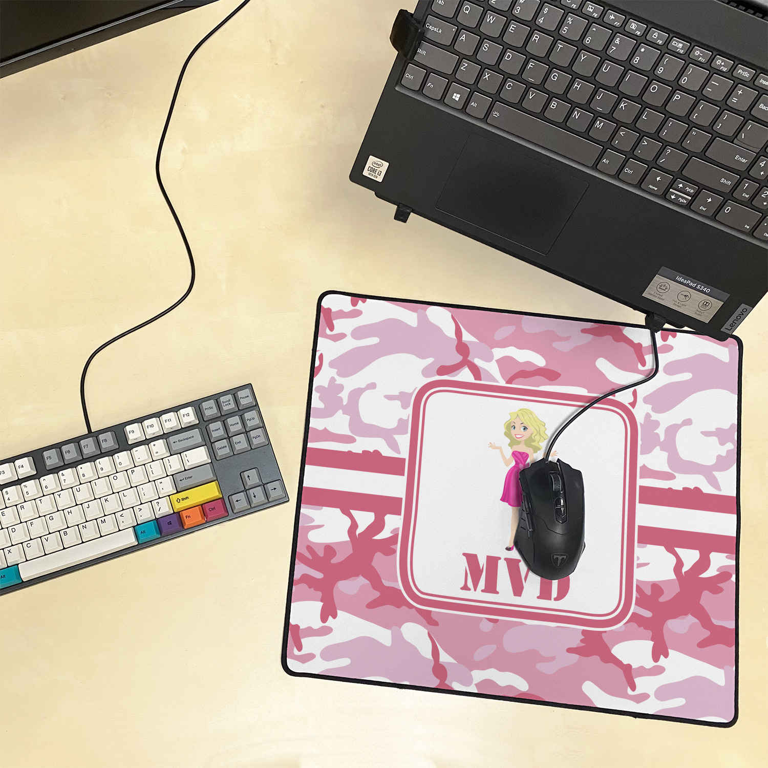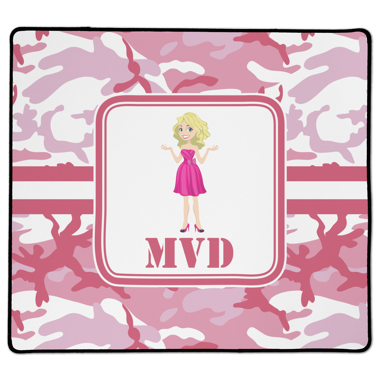 We have featured our little army girl, wearing her pink camo helmet, in the middle of the design in a pink and white square. A wide white band trimmed in pink tie everything together.