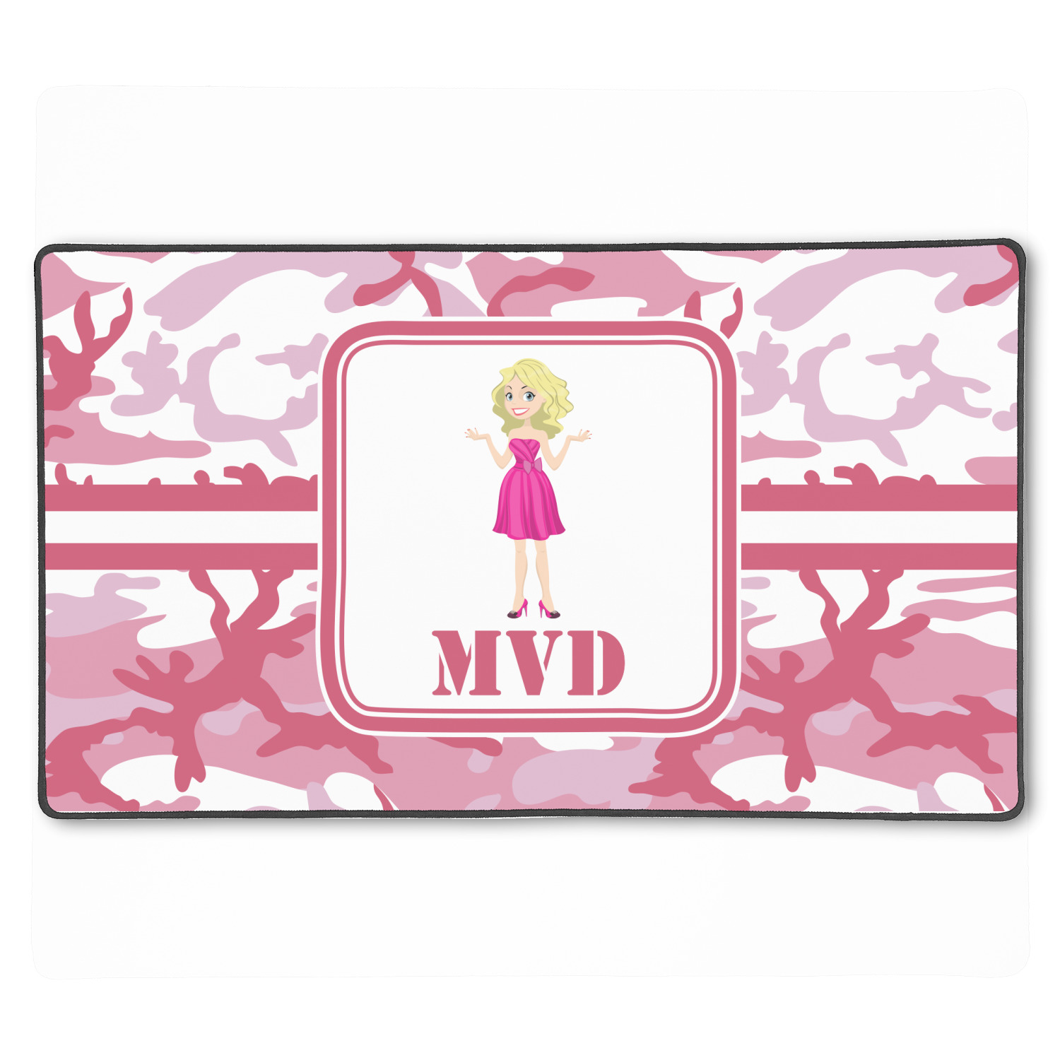 We have featured our little army girl, wearing her pink camo helmet, in the middle of the design in a pink and white square. A wide white band trimmed in pink tie everything together.