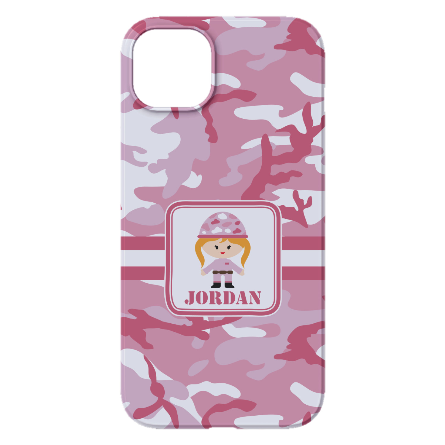 We have featured our little army girl, wearing her pink camo helmet, in the middle of the design in a pink and white square. A wide white band trimmed in pink tie everything together.