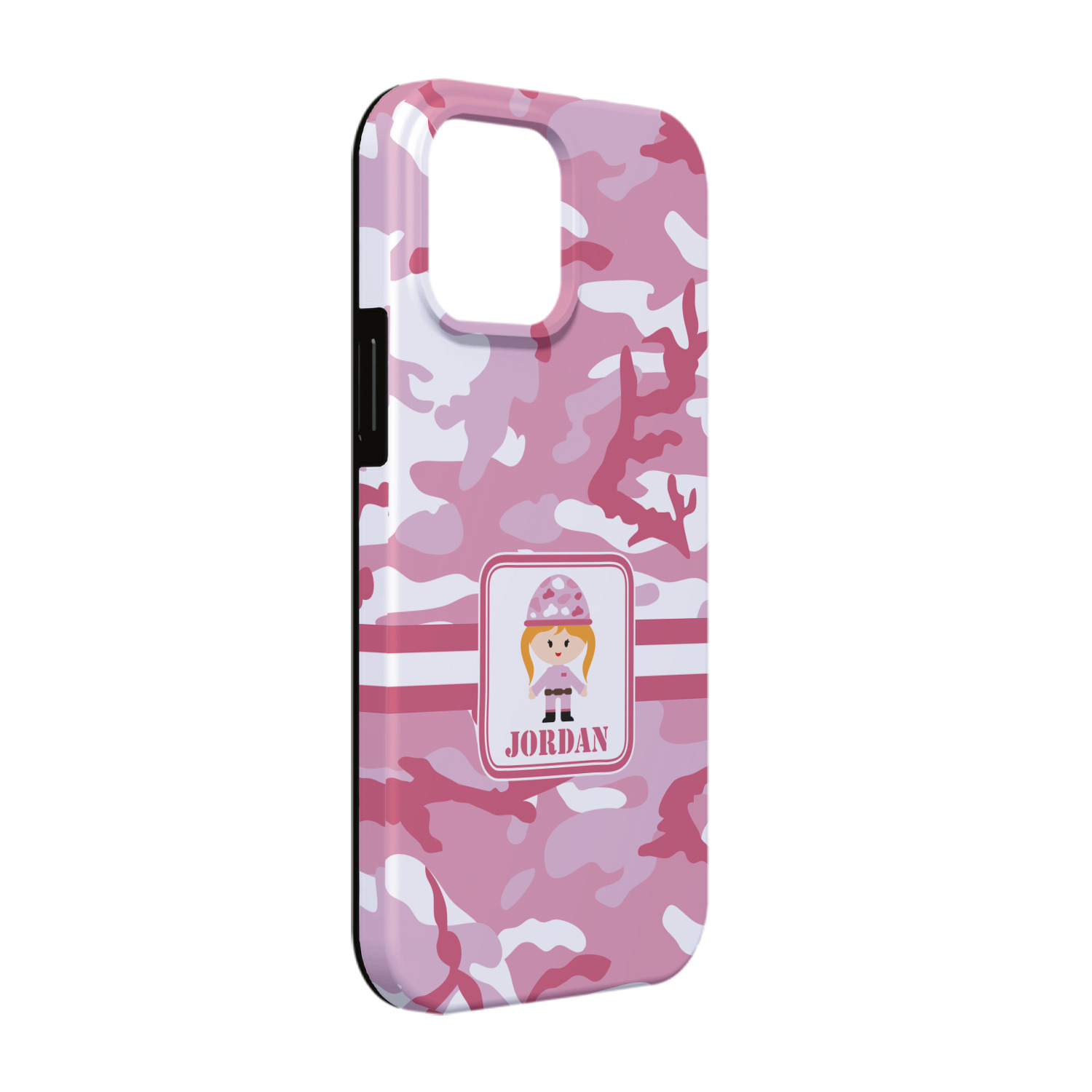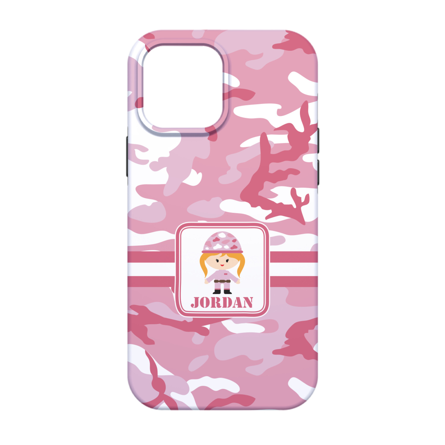 We have featured our little army girl, wearing her pink camo helmet, in the middle of the design in a pink and white square. A wide white band trimmed in pink tie everything together.