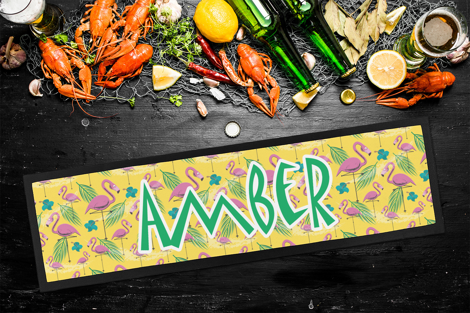 The idyllic tropical vacation includes palm trees, flirty flowers, and flamingos. This design encompasses all these things and more, on a bright yellow background with sand sprawled carefully throughout.