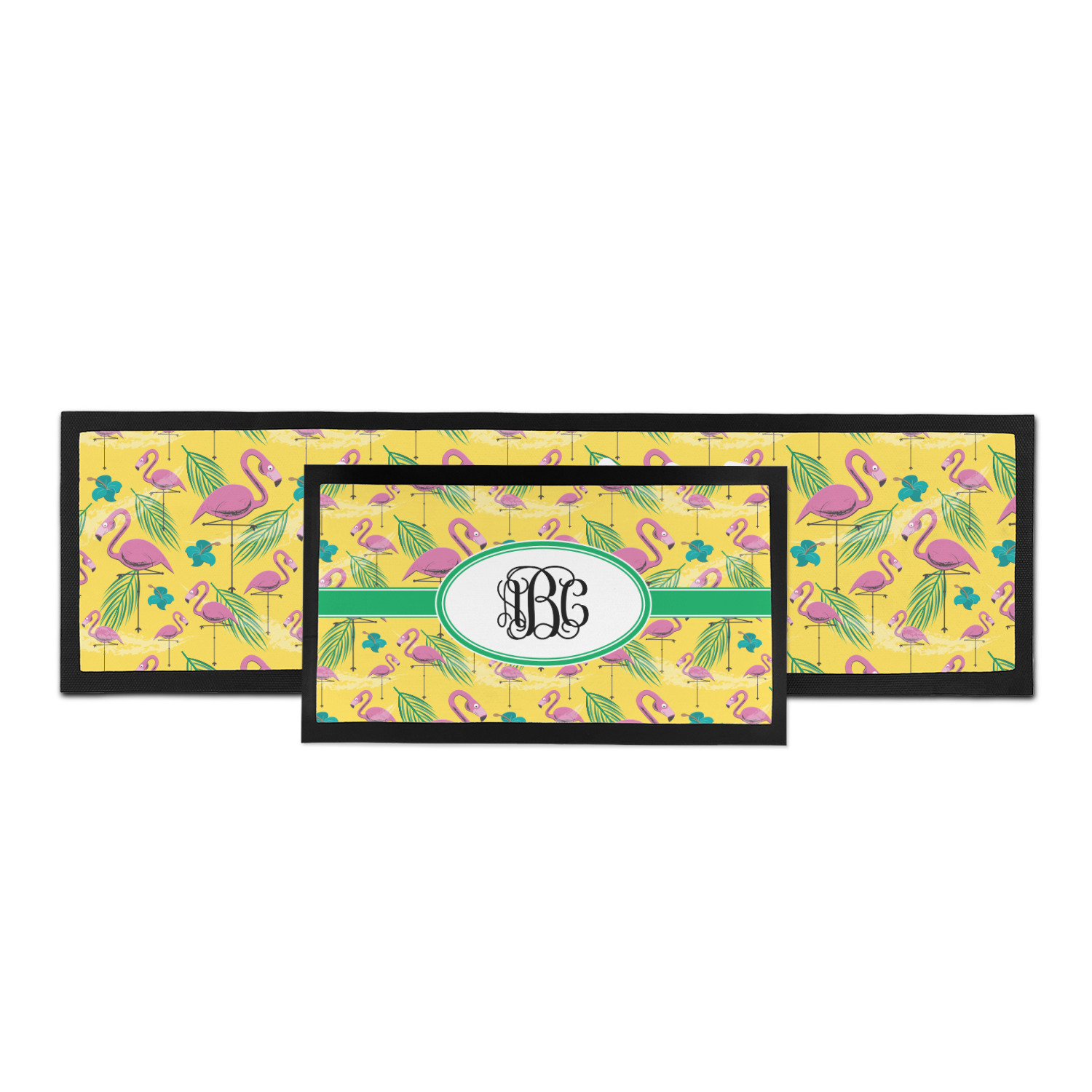 The idyllic tropical vacation includes palm trees, flirty flowers, and flamingos. This design encompasses all these things and more, on a bright yellow background with sand sprawled carefully throughout.