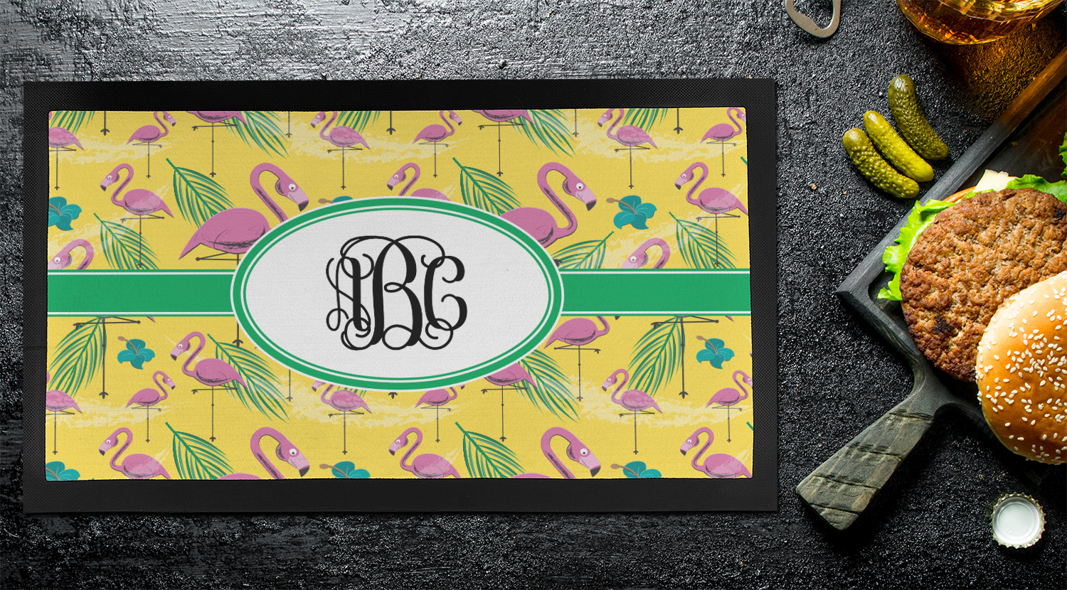 The idyllic tropical vacation includes palm trees, flirty flowers, and flamingos. This design encompasses all these things and more, on a bright yellow background with sand sprawled carefully throughout.