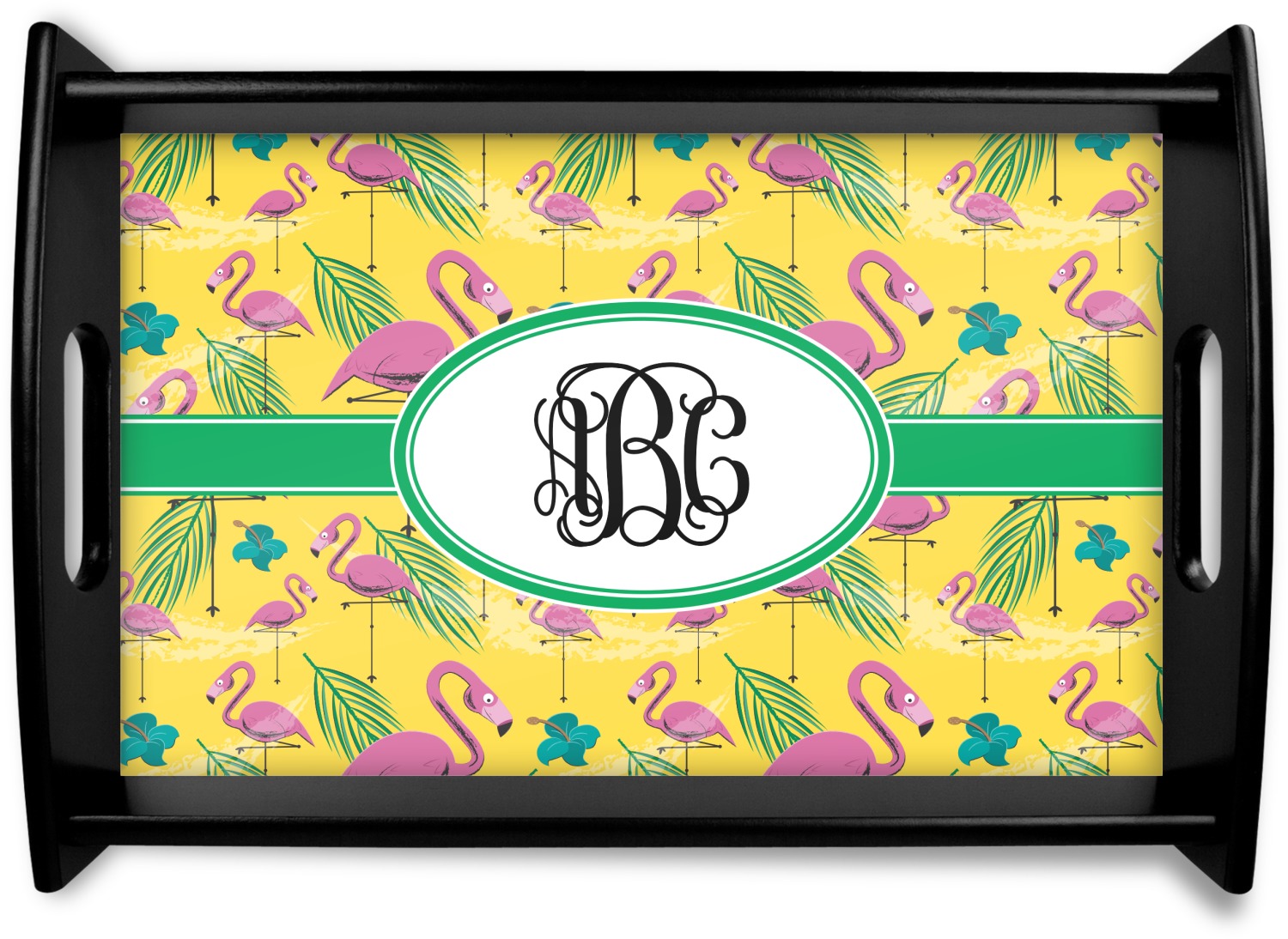 This serving tray with handles features square edges and two rounded sides, creating a very modern look. Each side is fabricated from a beautifully cut, natural wood. The bottom of the interior of the tray displays your customized design in bright, vibrant color. The tray is sold in both a black color and a natural wood look. Each variation of the wood serving tray has two sizes: Small, which is 14" x 10" x 2.25", and Large, which is 19.5" x 13.5" x 2.75".