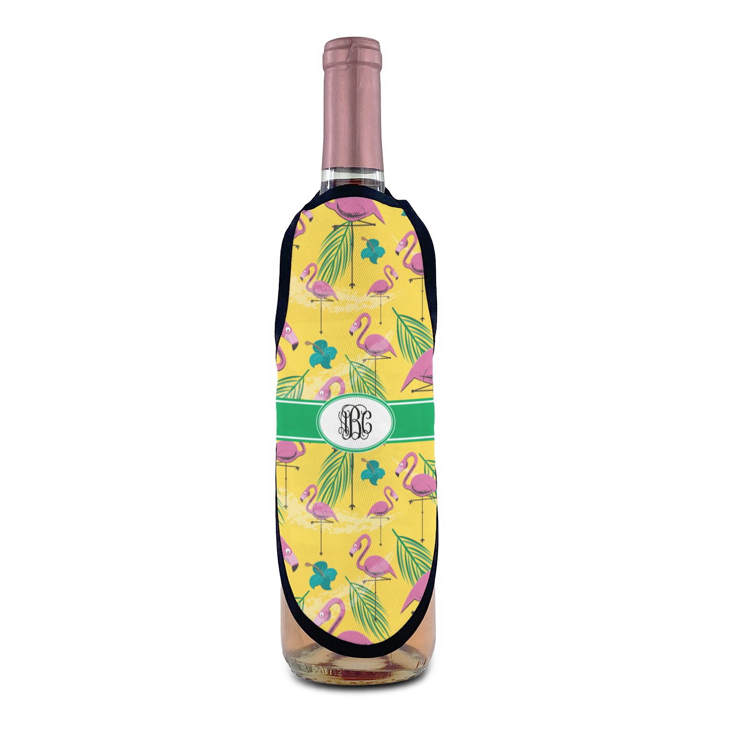 Made from a polyester fabric with black trim and tie string, these bottle aprons fit most large sized bottles including wine bottles, liquor bottles and dish soap bottles. With an included sliding cord lock the neck is adjustable to make these be a universal fit for most any sized bottle. The printed space of the apron measures approximately 8.5" tall and at its widest point the printed area is 6" wide.