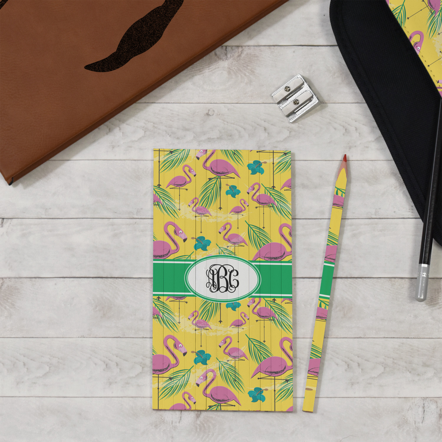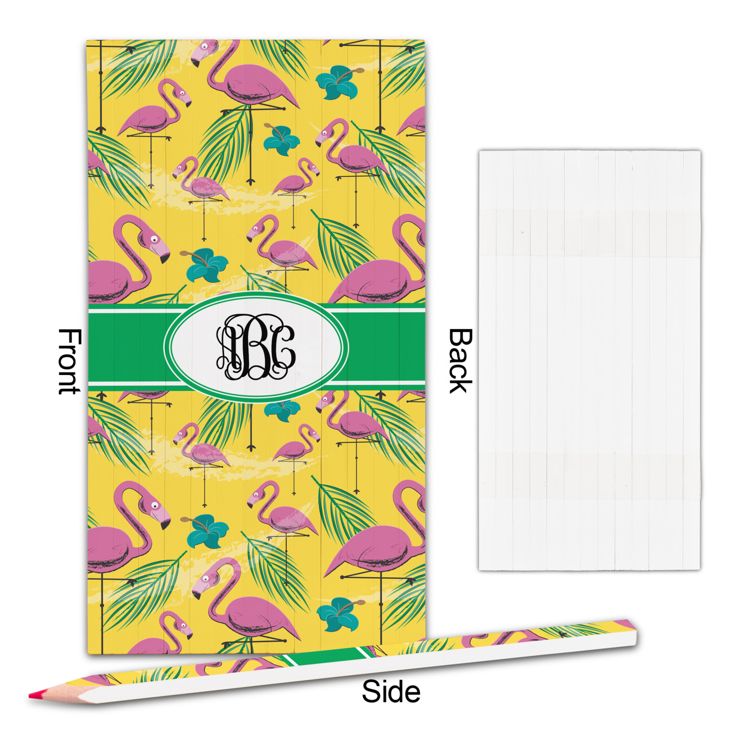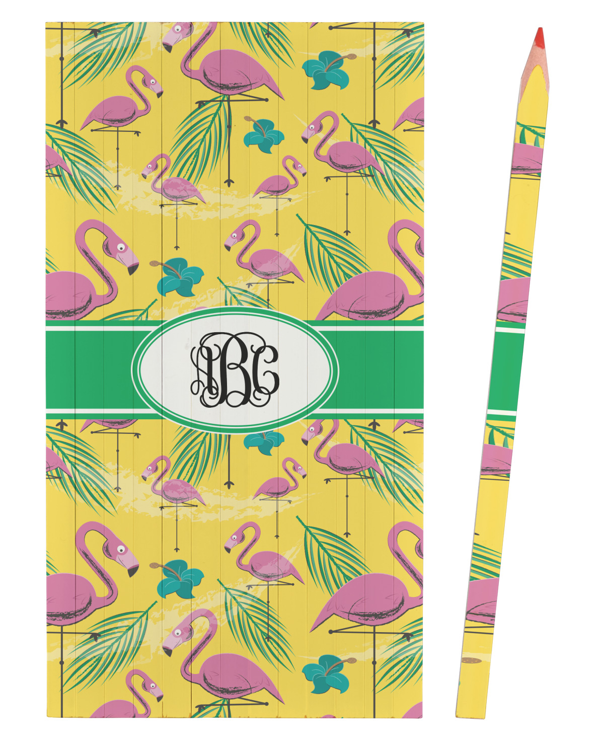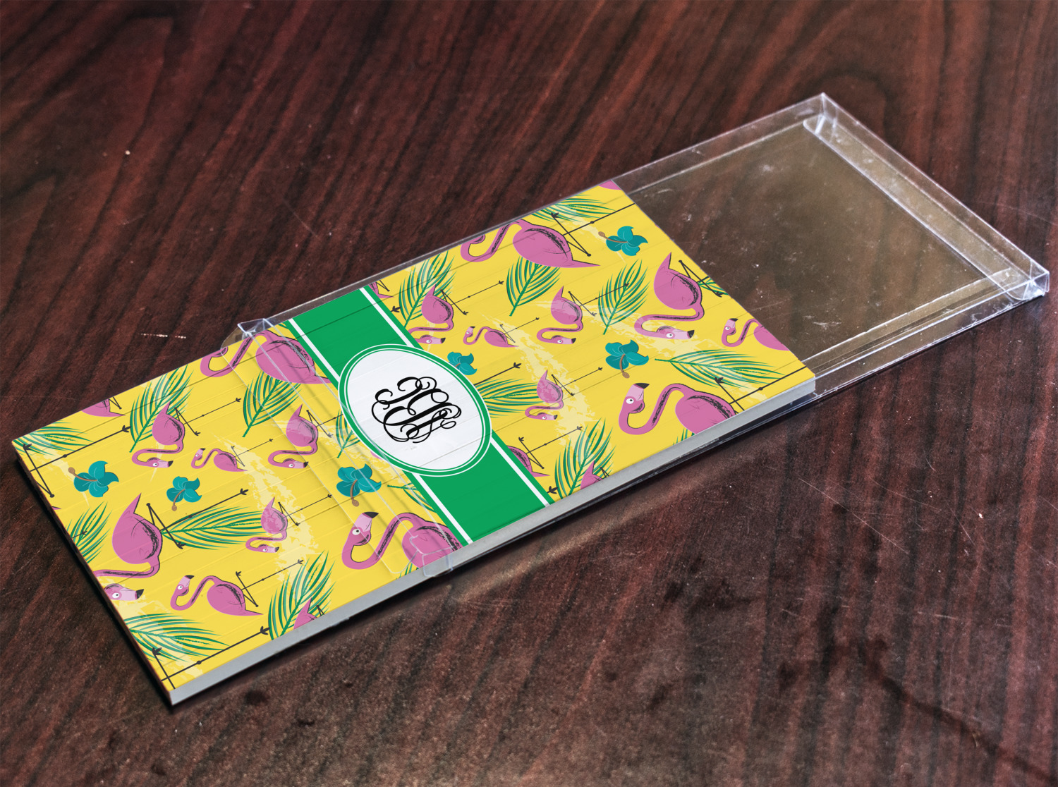 The idyllic tropical vacation includes palm trees, flirty flowers, and flamingos. This design encompasses all these things and more, on a bright yellow background with sand sprawled carefully throughout.