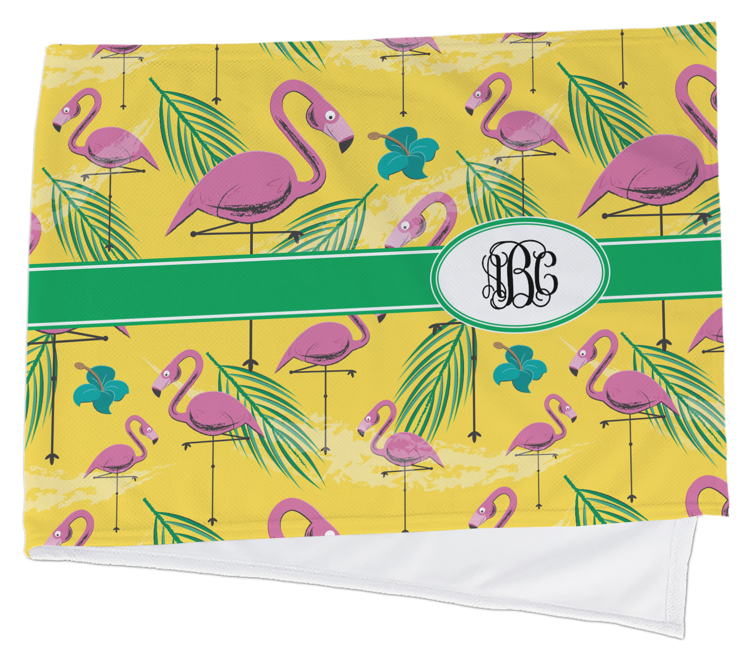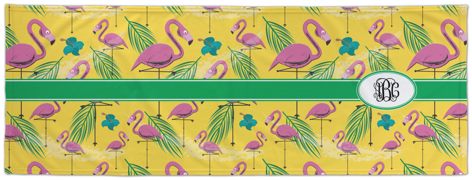 The idyllic tropical vacation includes palm trees, flirty flowers, and flamingos. This design encompasses all these things and more, on a bright yellow background with sand sprawled carefully throughout.