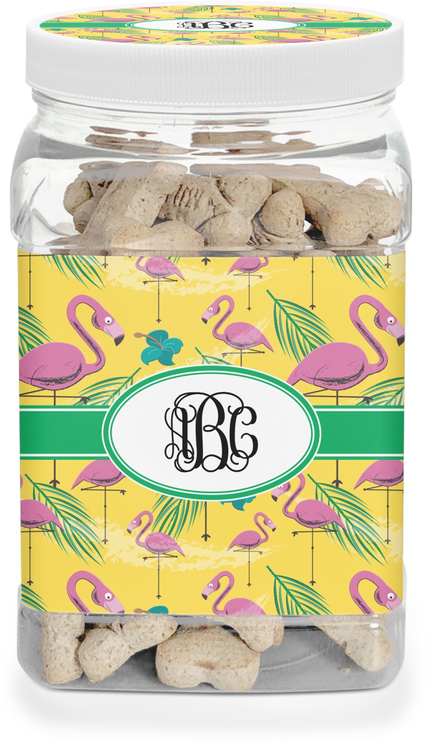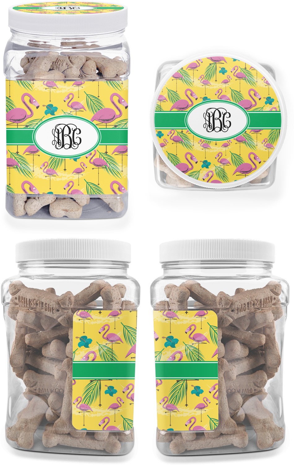 This half gallon jar, made from a sturdy plastic, is the perfect way to keep treats from any naughty pet paws, while still keeping them ready on hand for when your pup performs an impressive trick. This dog cookie jar features a screw-on, white lid that displays your personalized design on a vinyl sticker. We apply another customized sticker that wraps around the front and sides of the jar. Our dog treat jar also has indentations on the rear ends of the sides, which allows for convenient handling, and its square frame allows for easy storage.